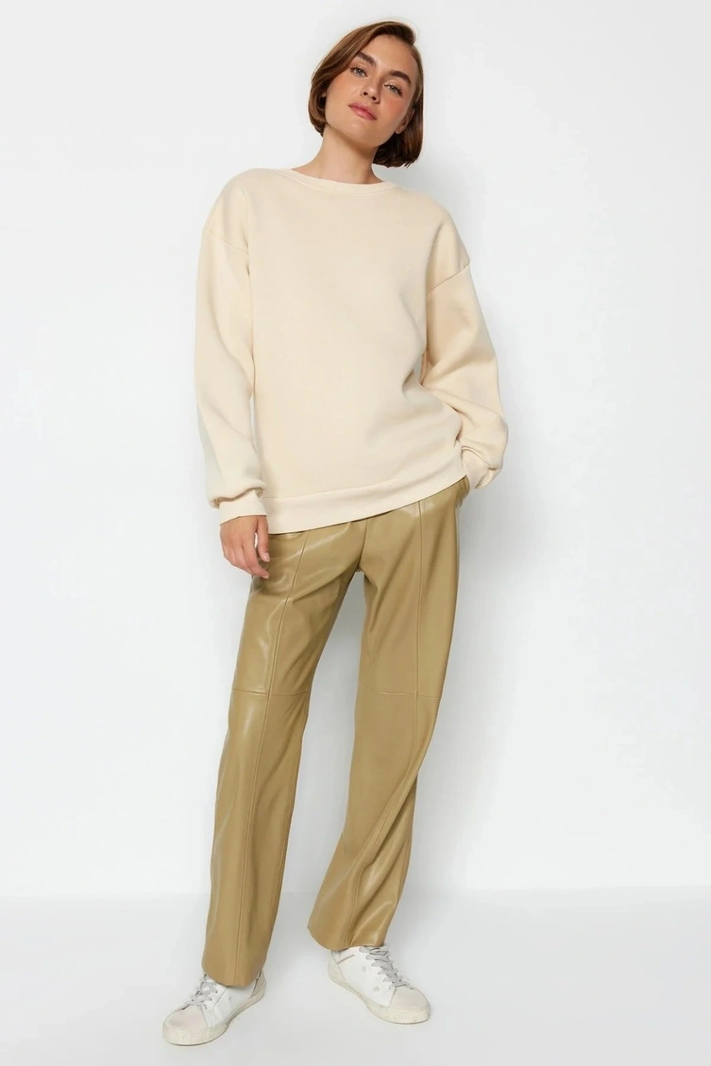 3 iplik şardonlu bisiklet yaka sweatshirt bej