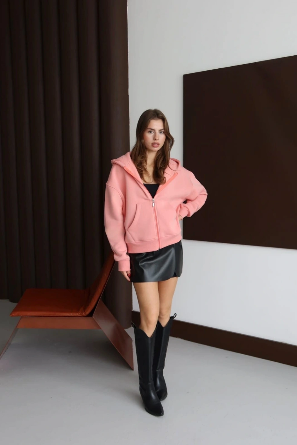 3 iplik şardonlu Kapşonlu fermuarlı kısa üst pembe pat8590