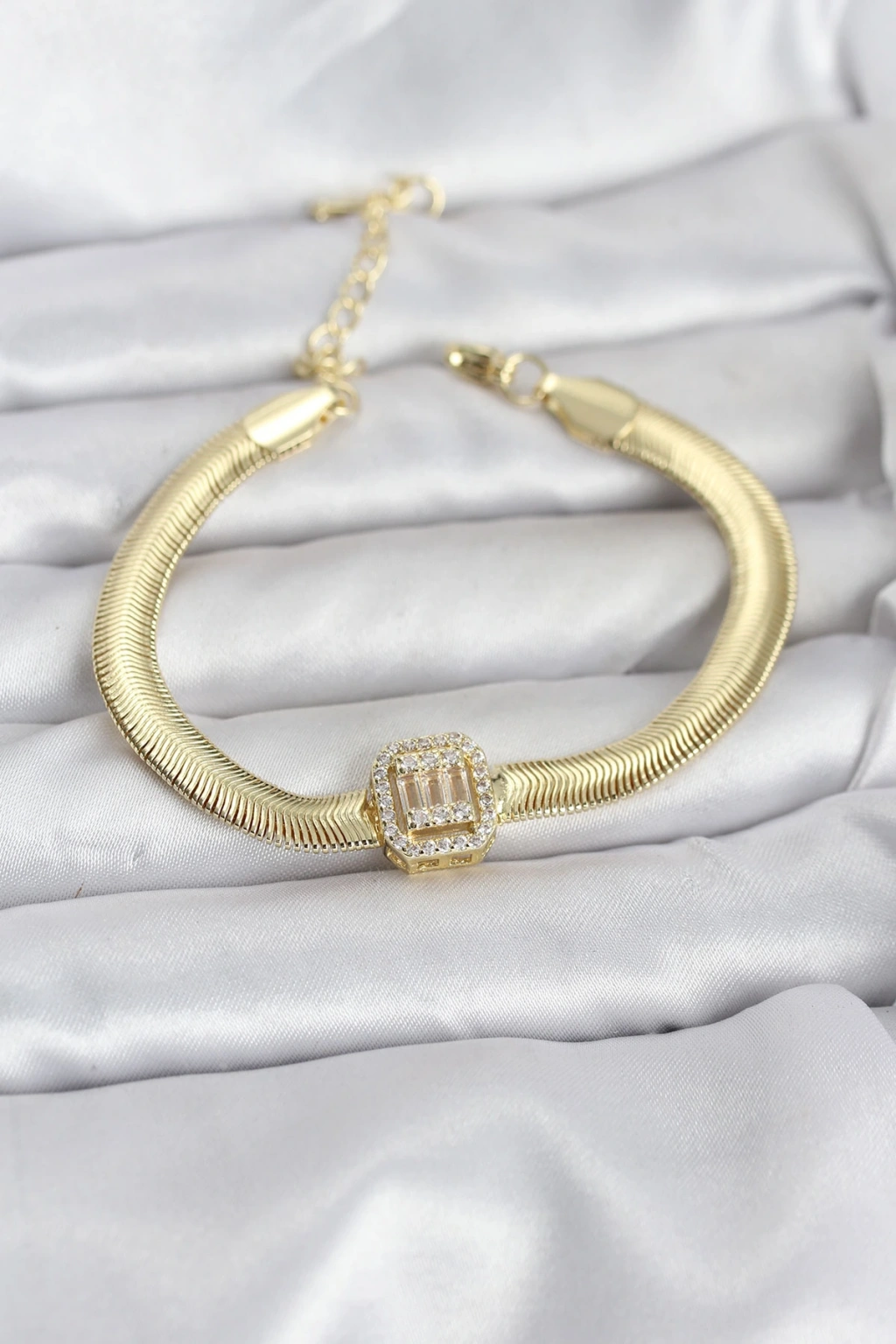 316L Çelik Gold Renk Kare Zirkon Taşlı Yılan Zincirli Kadın Bileklik