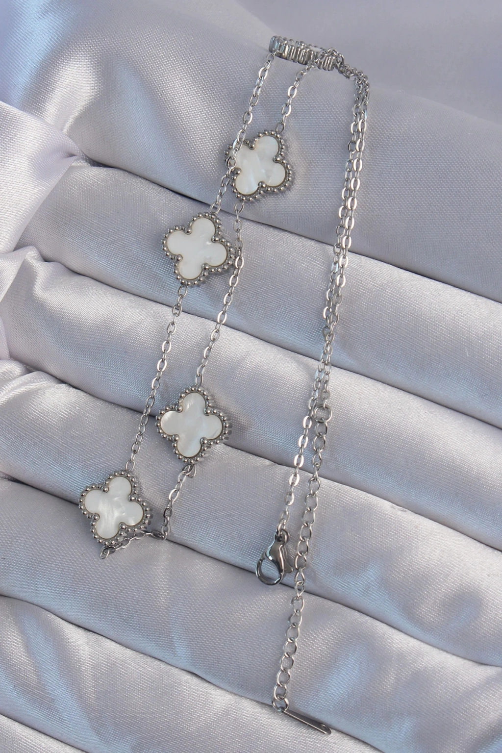 316L Çelik Gümüş Renk Beyaz Sedefli Yonca Kolye