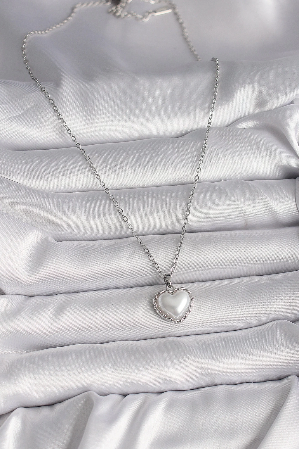 316L Çelik Gümüş Renk Zincir 3D İnci Kalp Model Kadın Kolye