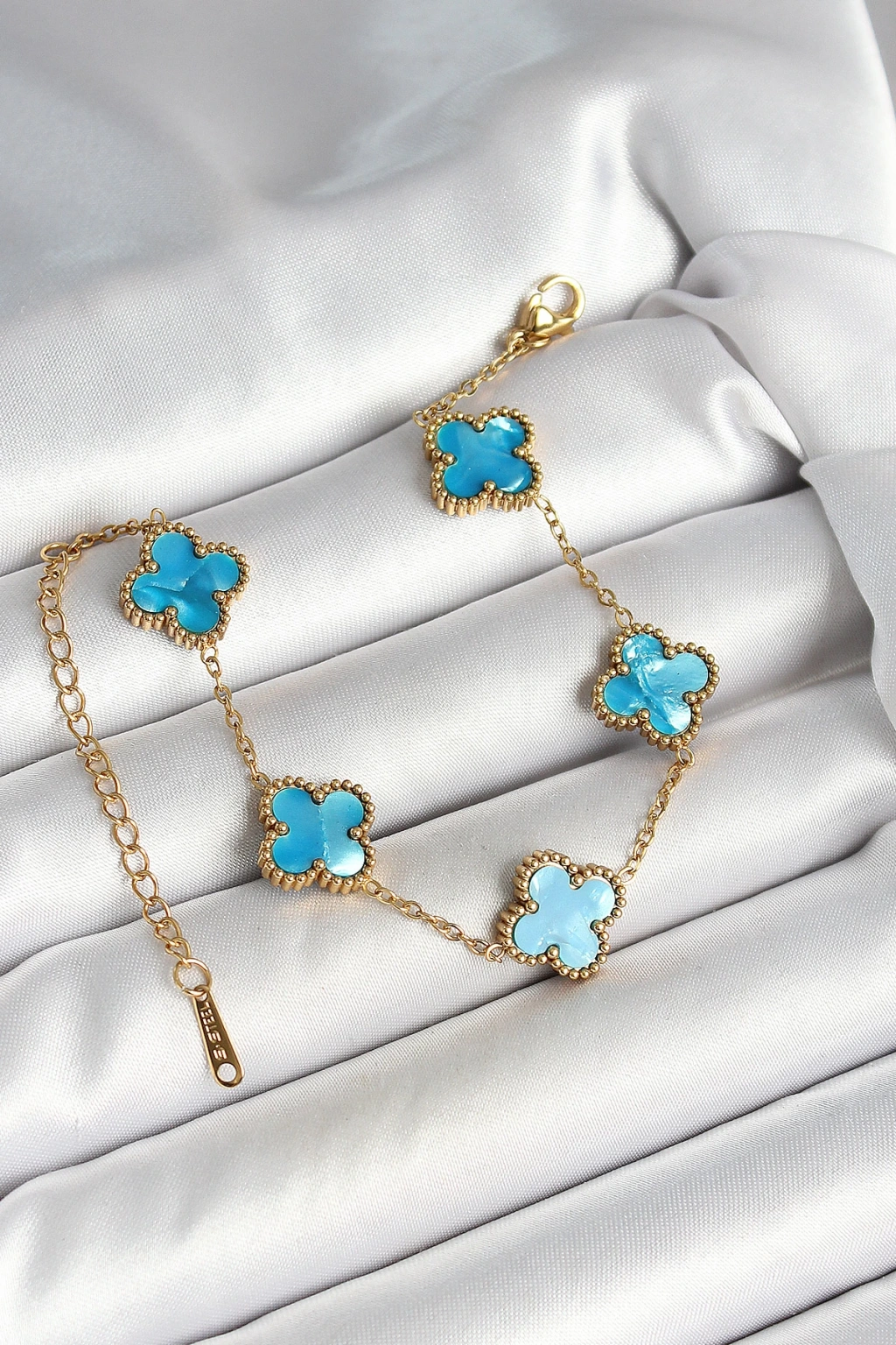 316L Çelik Sedefli Gökyüzü Mavisi Gold Renk Yonca Kadın Bileklik