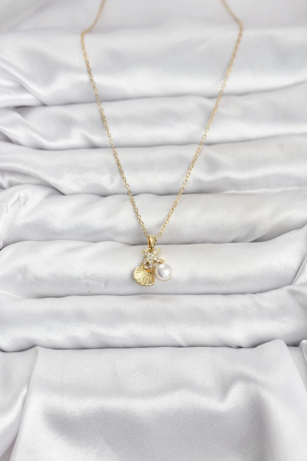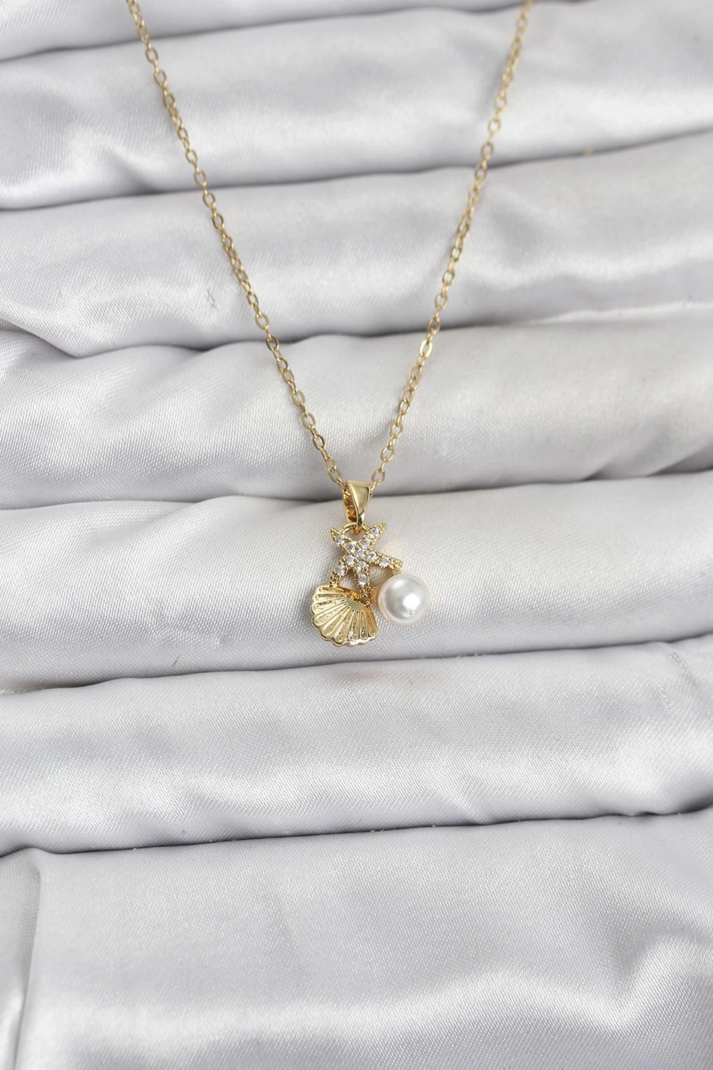 316L Çelik Zincir Gold Renk Deniz Kabuğu ve Deniz Yıldızı Model Zirkon Taşlı Kadın Kolye