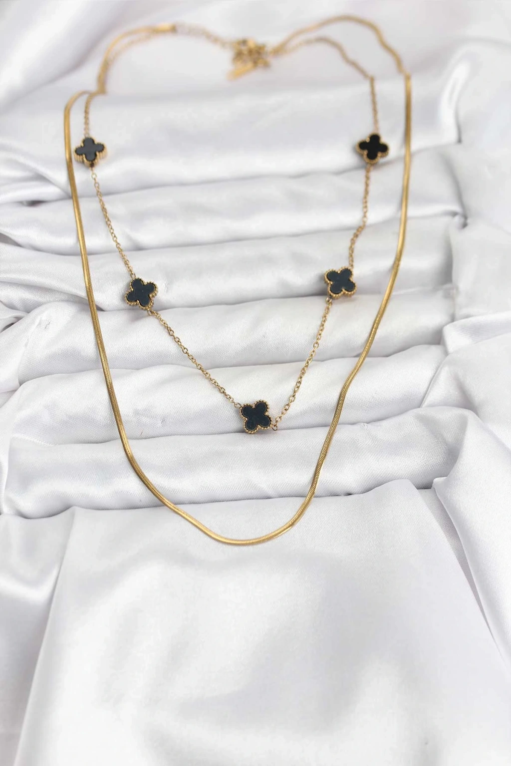 316L Çelik Zincir Gold Renk İtalyan Zincirli Siyah Yonca Model Kadın Kolye