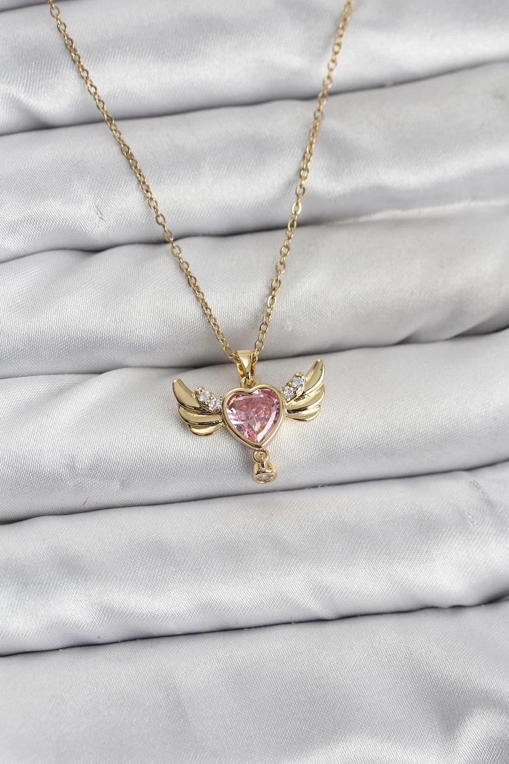 316L Çelik Zincir Gold Renk Kanatlı Kalp Model Zirkon Taşlı Kadın Kolye