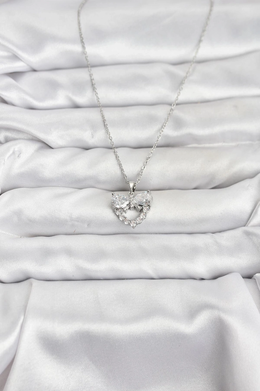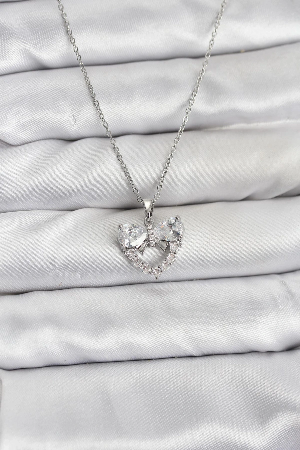 316L Çelik Zincir Gümüş Renk Kalp ve Fiyonk Model Zirkon Taşlı Kadın Kolye