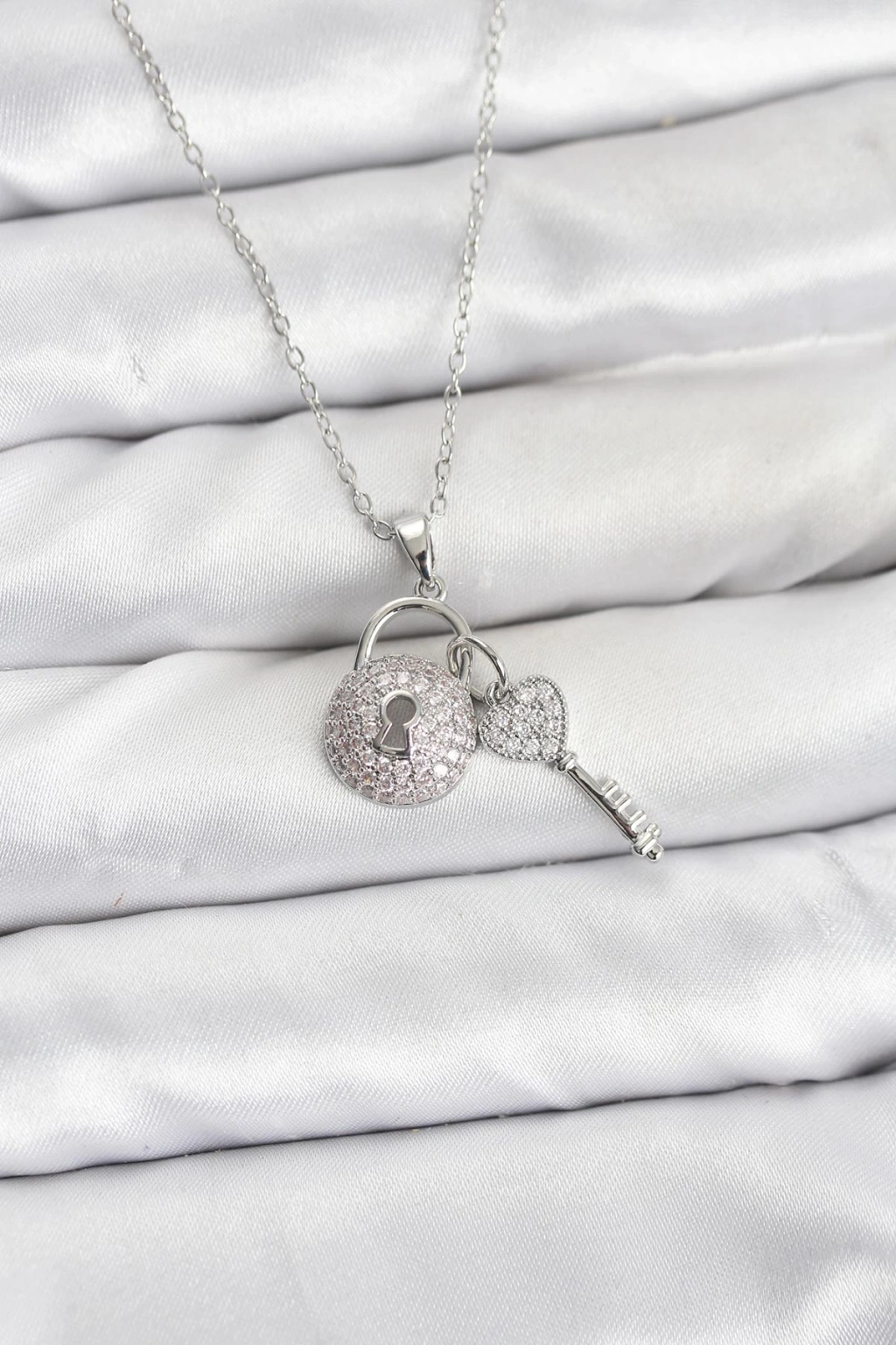 316L Çelik Zincir Gümüş Renk Kilit Anahtar Model Zirkon Taşlı Kadın Kolye