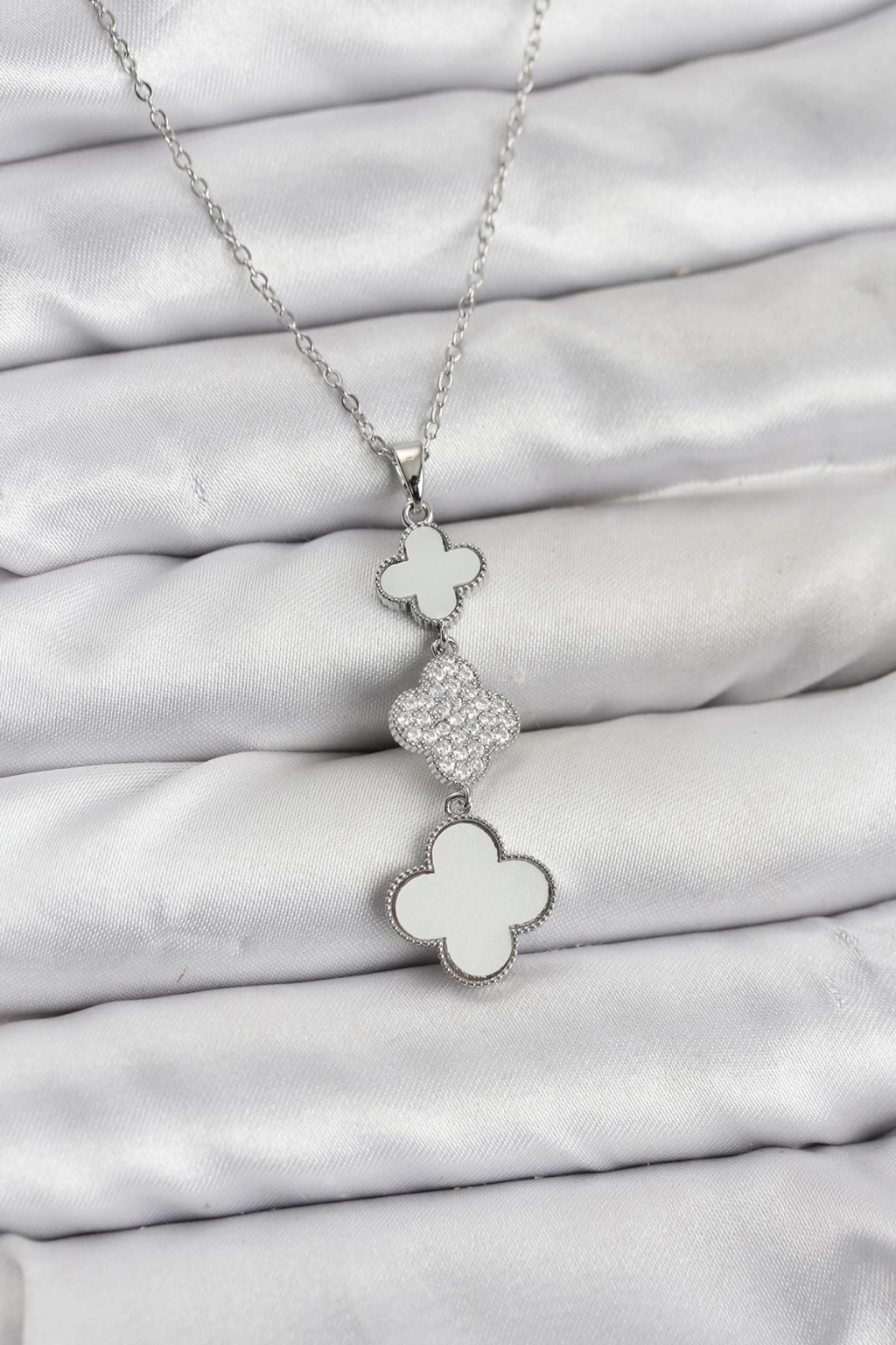 316L Çelik Zincir Gümüş Renk Yonca Detaylı Zirkon Taşlı Kadın Kolye