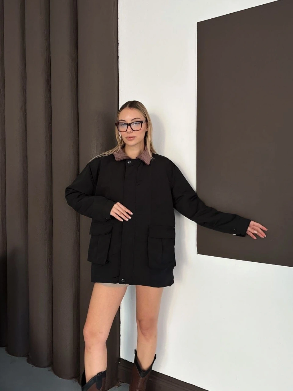 Astarlı yaka detaylı artos ceket siyah st2651019