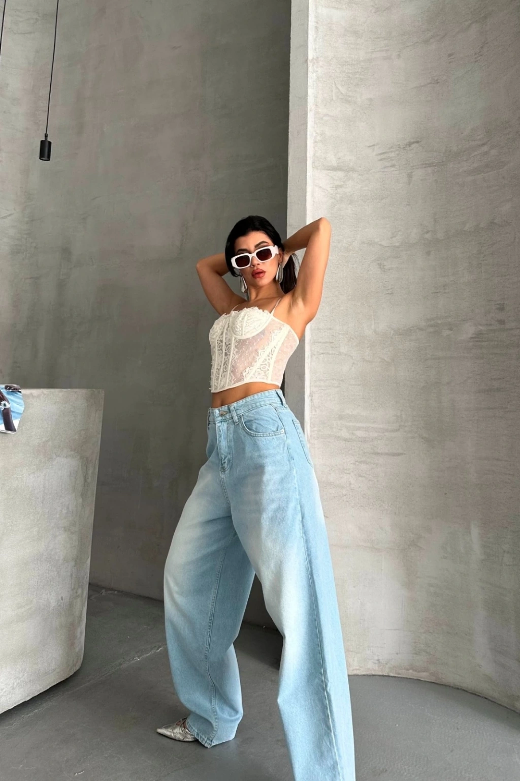 Palazzo straight kar yıkama jeans pantolon mavi d2008
