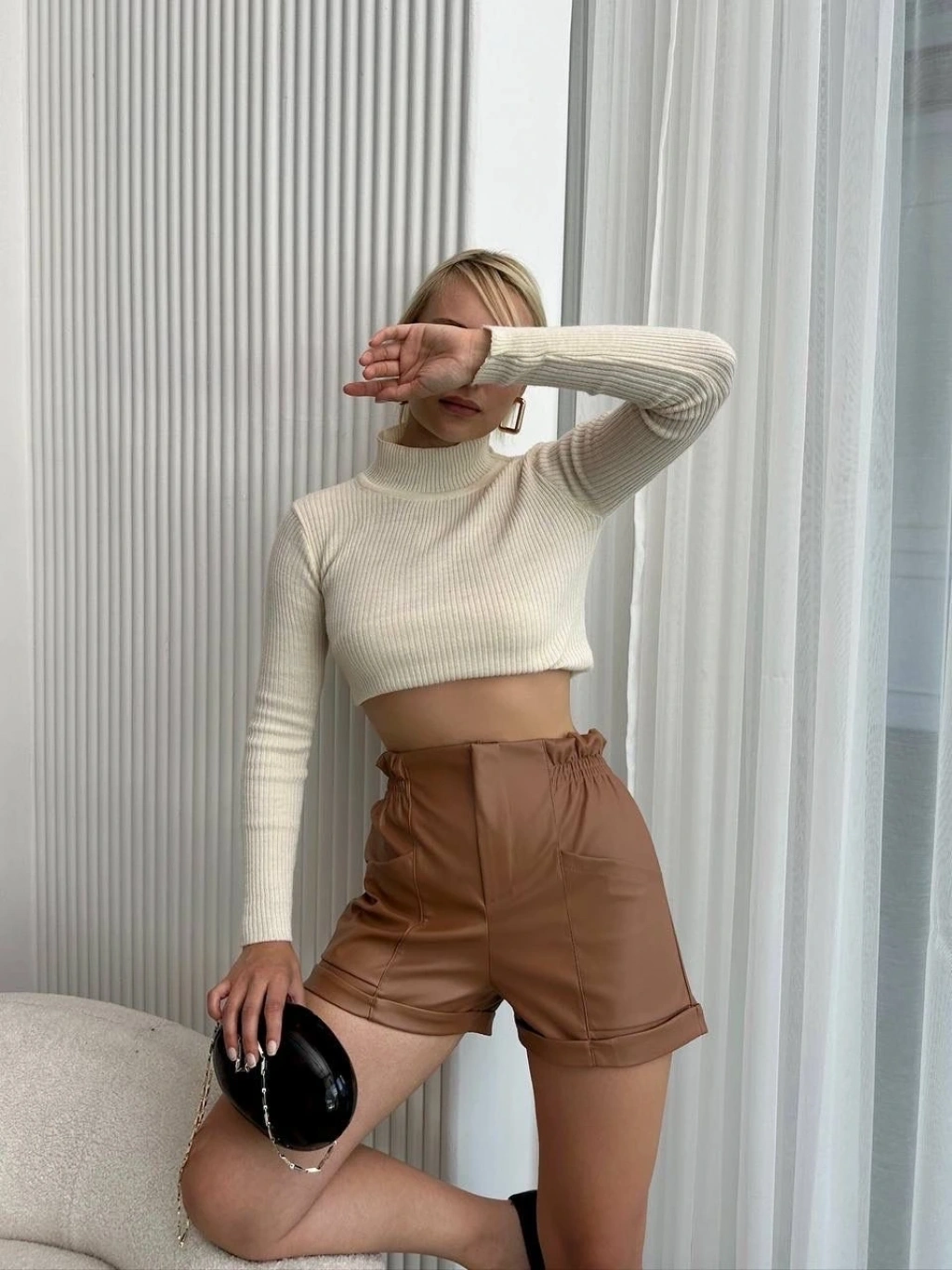 Pileli deri şort siyah h240053
