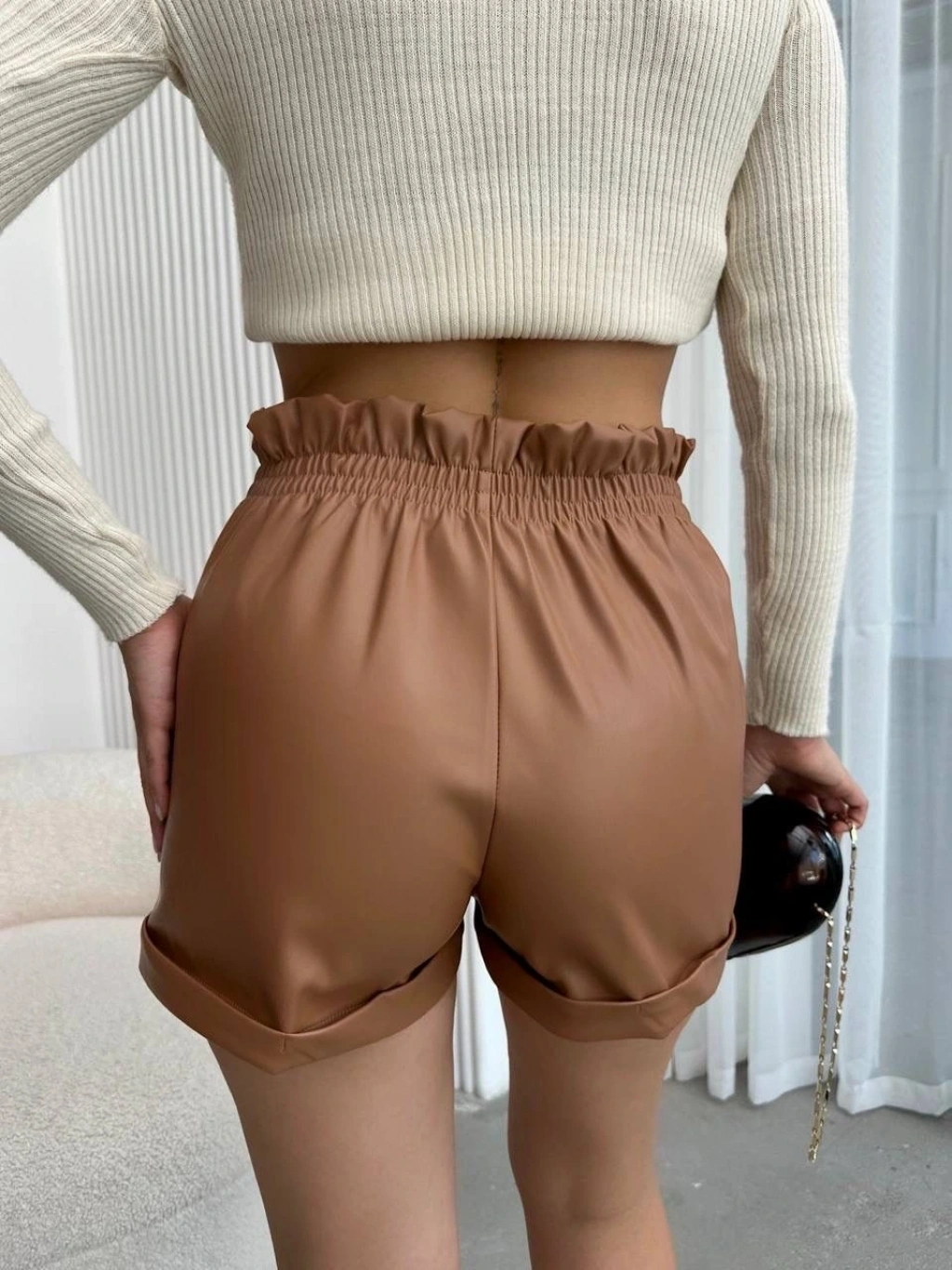 Beli lastikli deri şort kahve H24605
