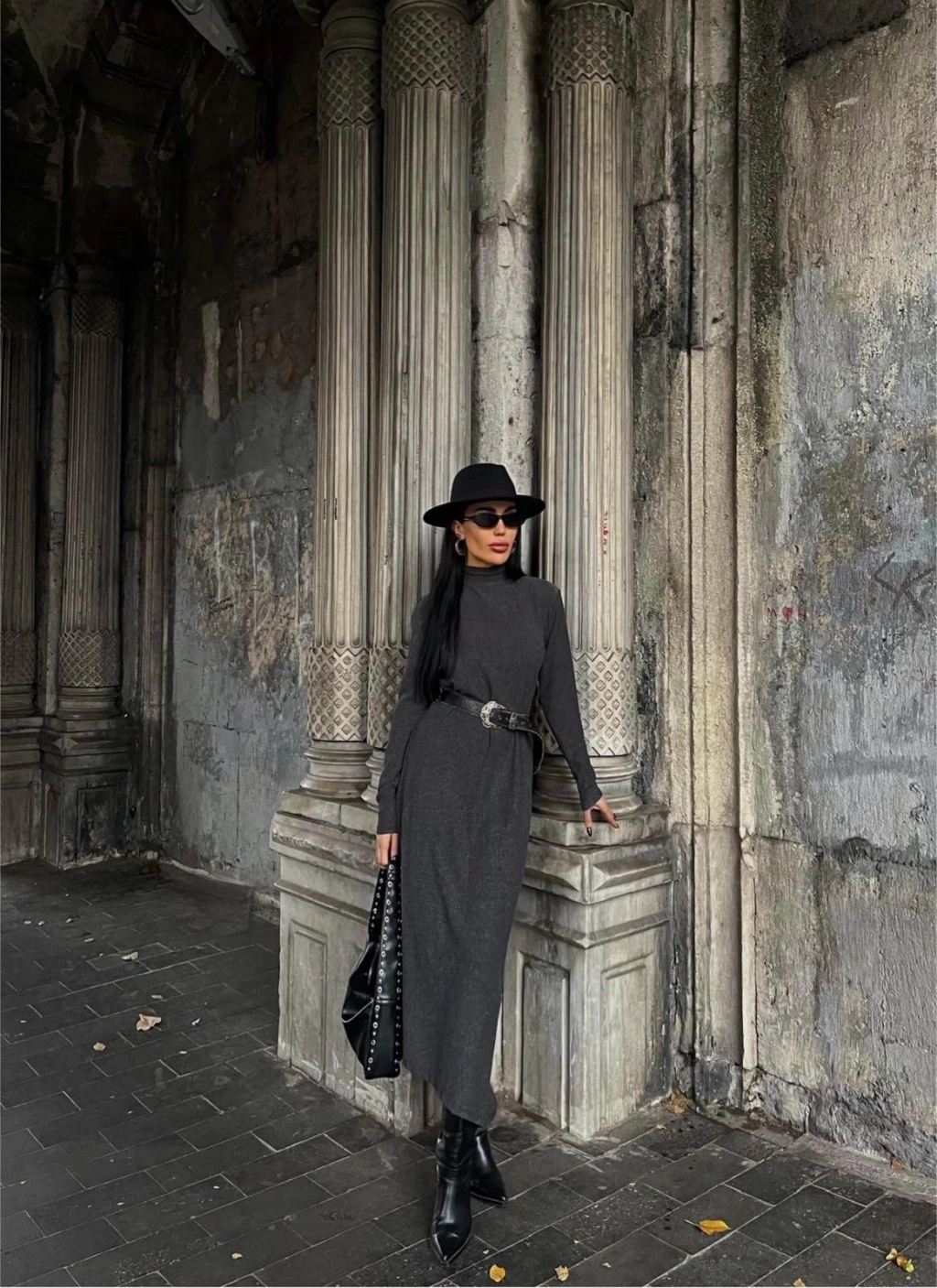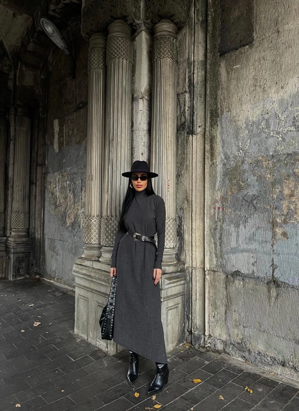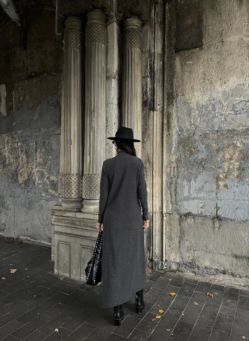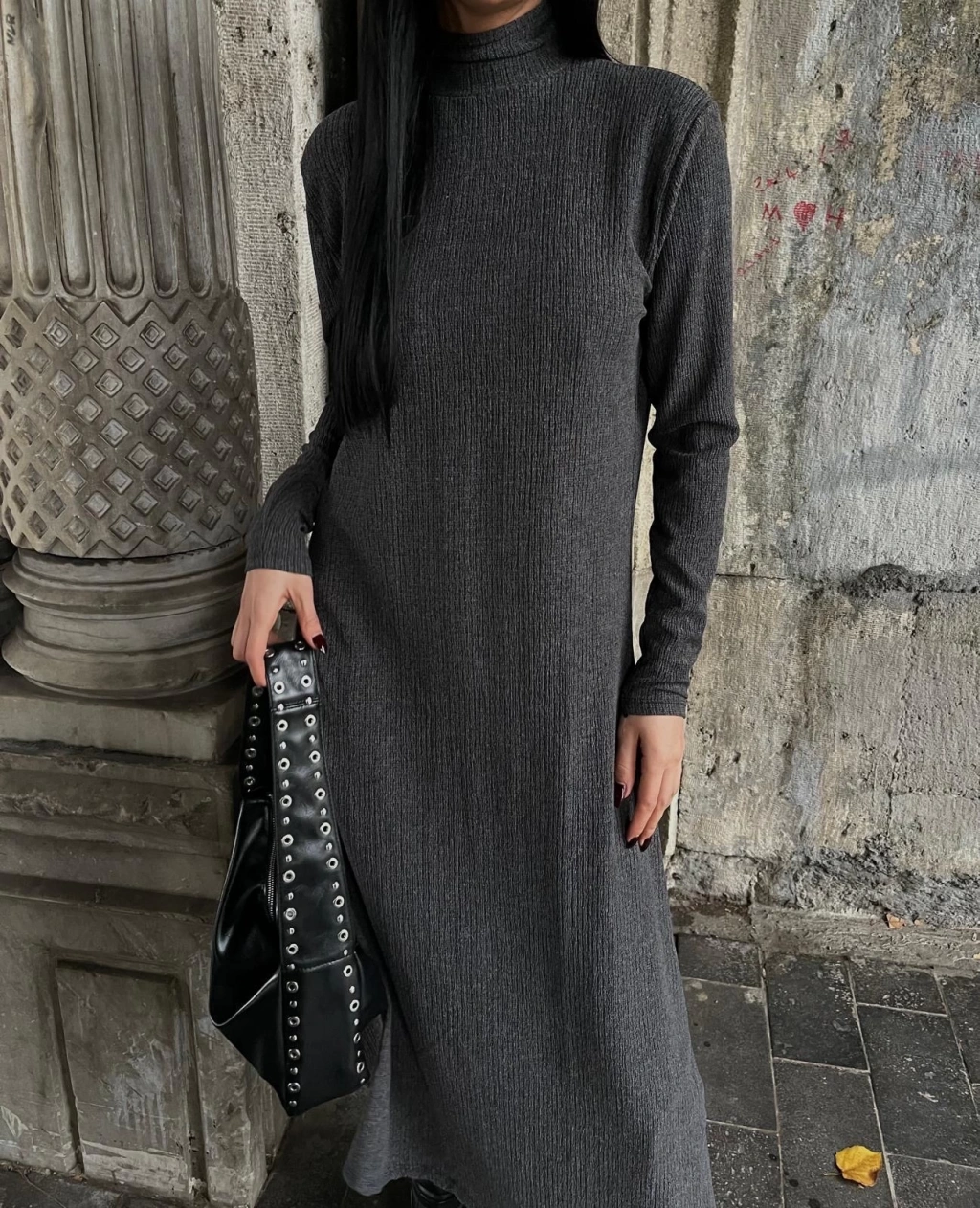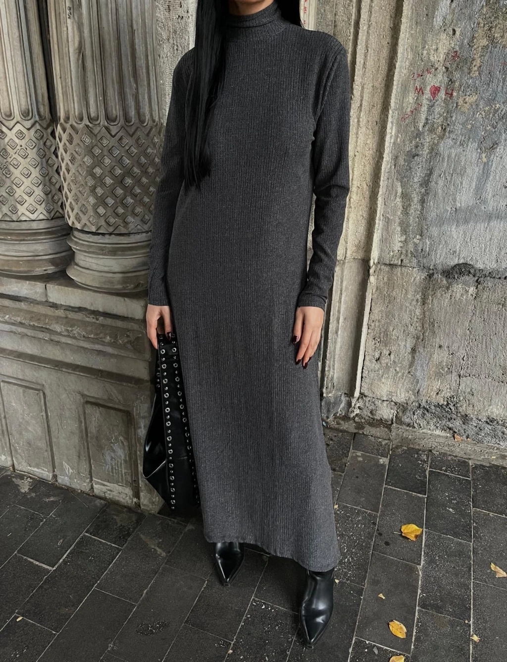 Boğazlı kalın bürümcük uzun elbise gri