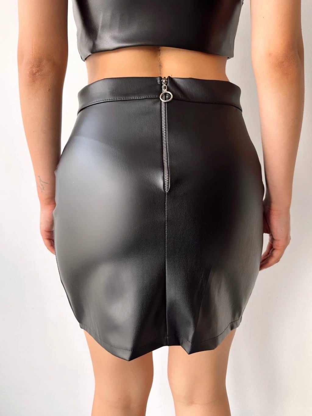 Cep detaylı oval kapaklı deri etek siyah h240048