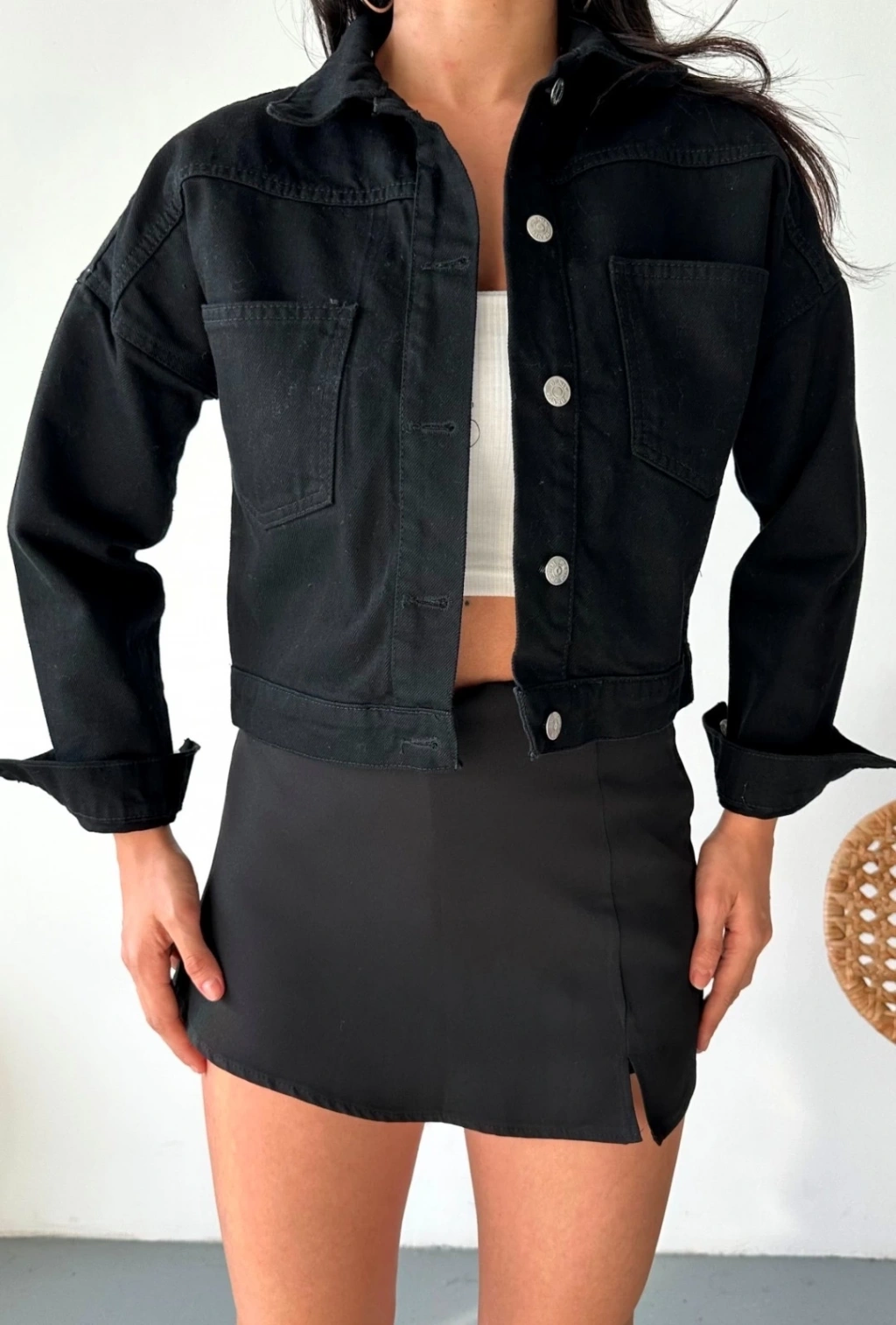 Çift cepli kol katlamalı süper taş enzim yıkamalı crop kot ceket siyah d2000