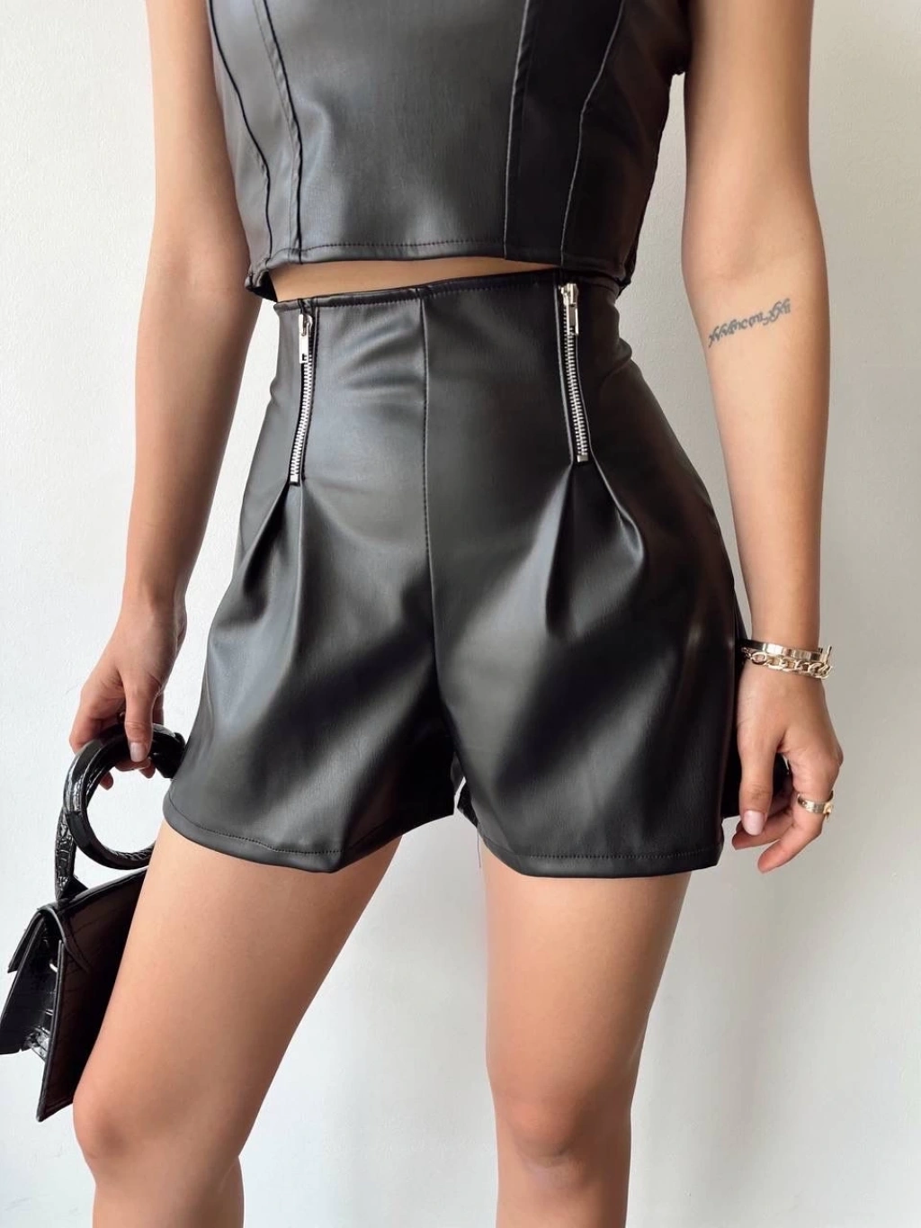 Beli lastikli çıtçıtlı deri şort krem w241007