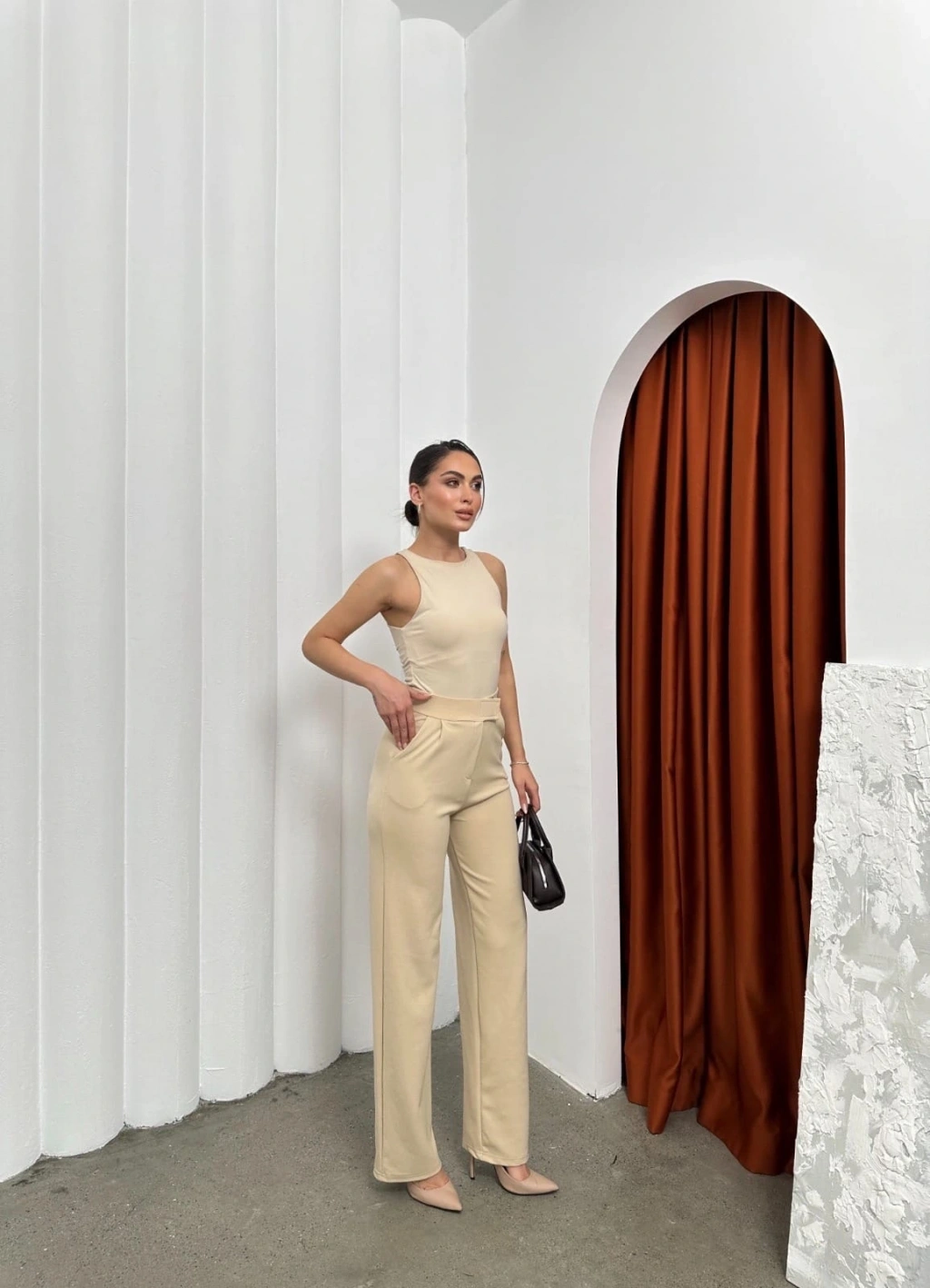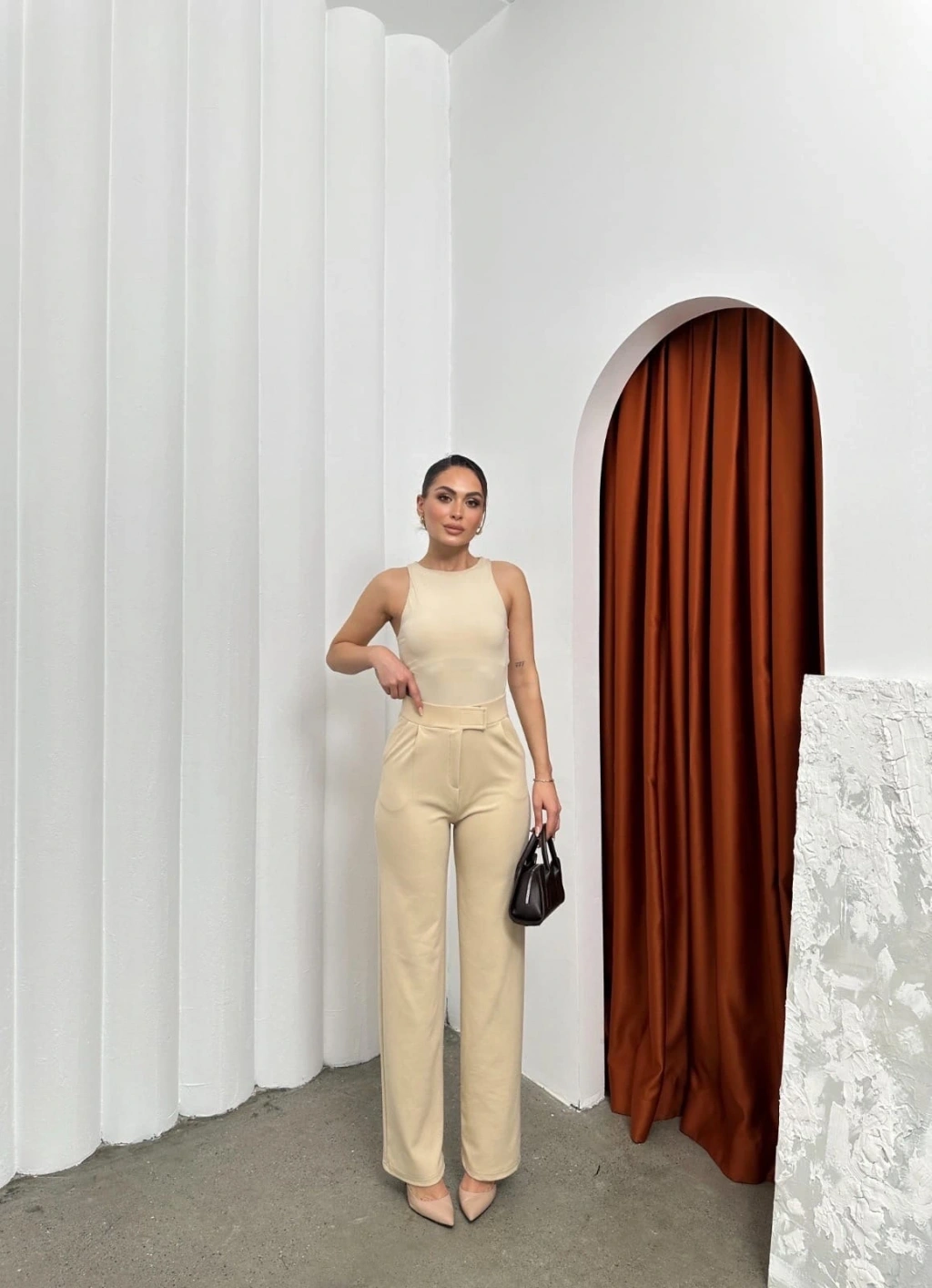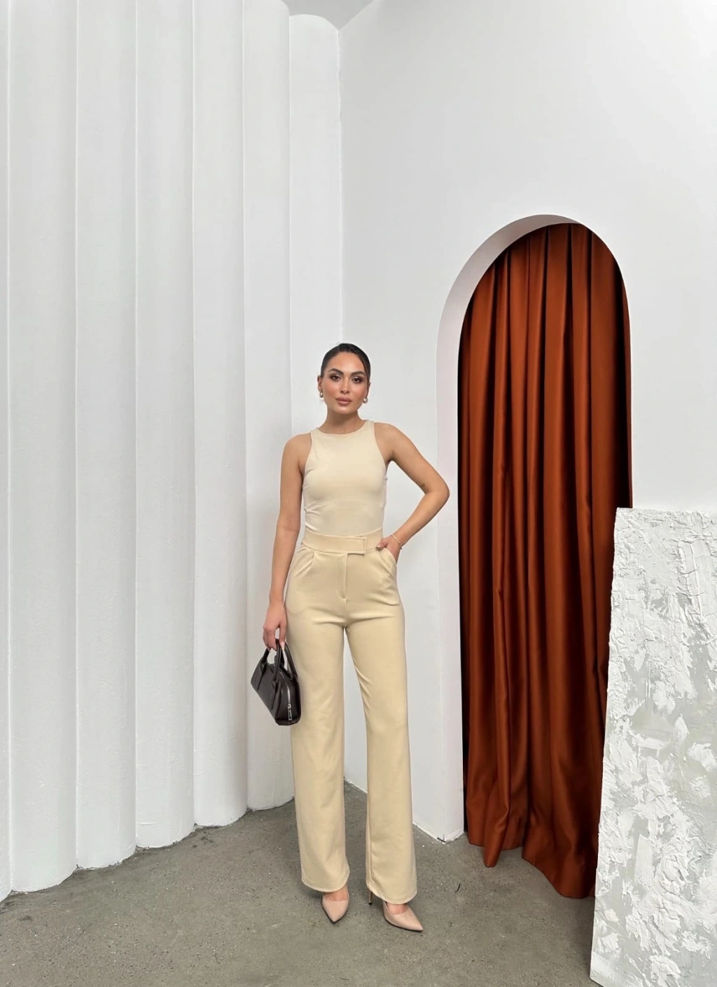 İspanyol yırtmaçlı paça deri pantolon bej hn