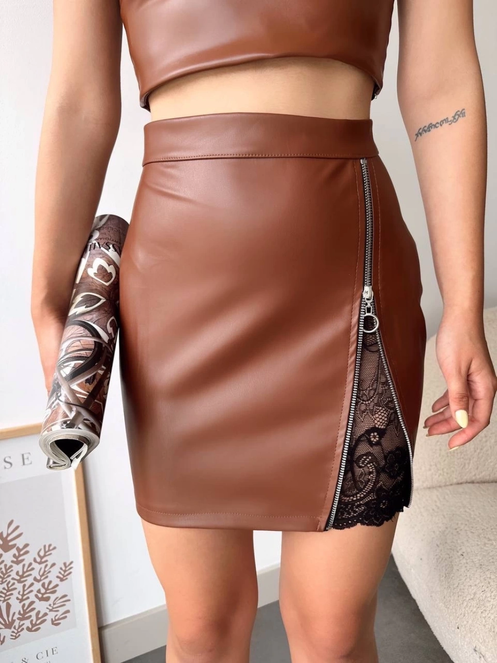 Cep detaylı oval kapaklı deri etek kahve h240048