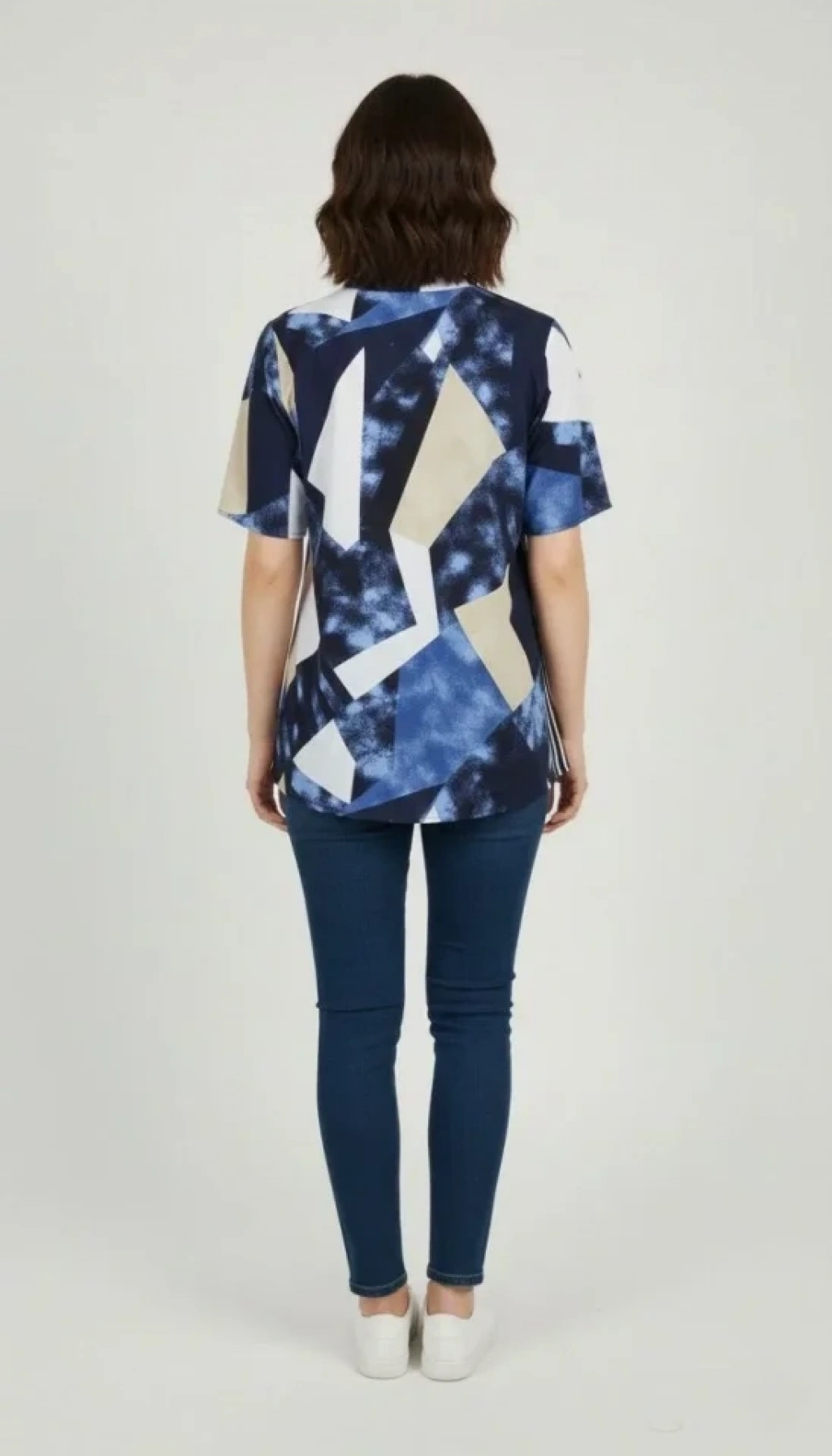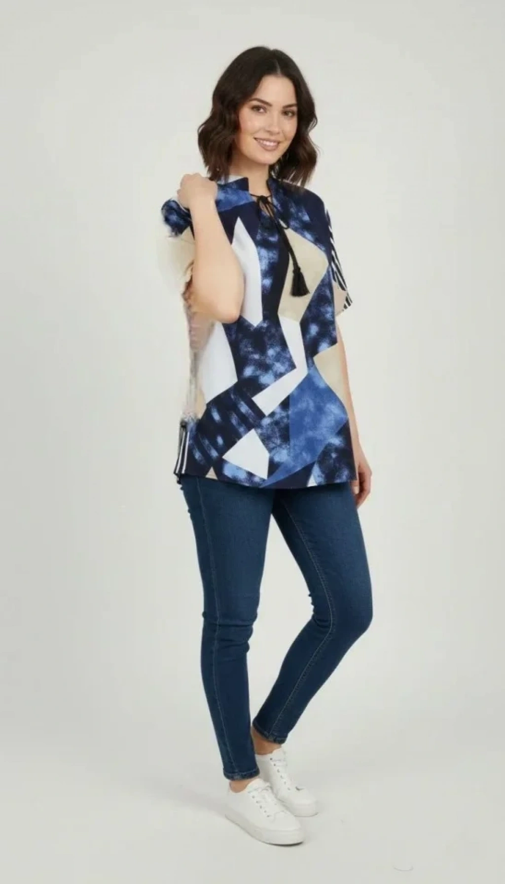 Desenli Püsküllü Viskon Bluz Bebe Yaka Kısa Kollu Big Size Rahat Kesim - Desenli
