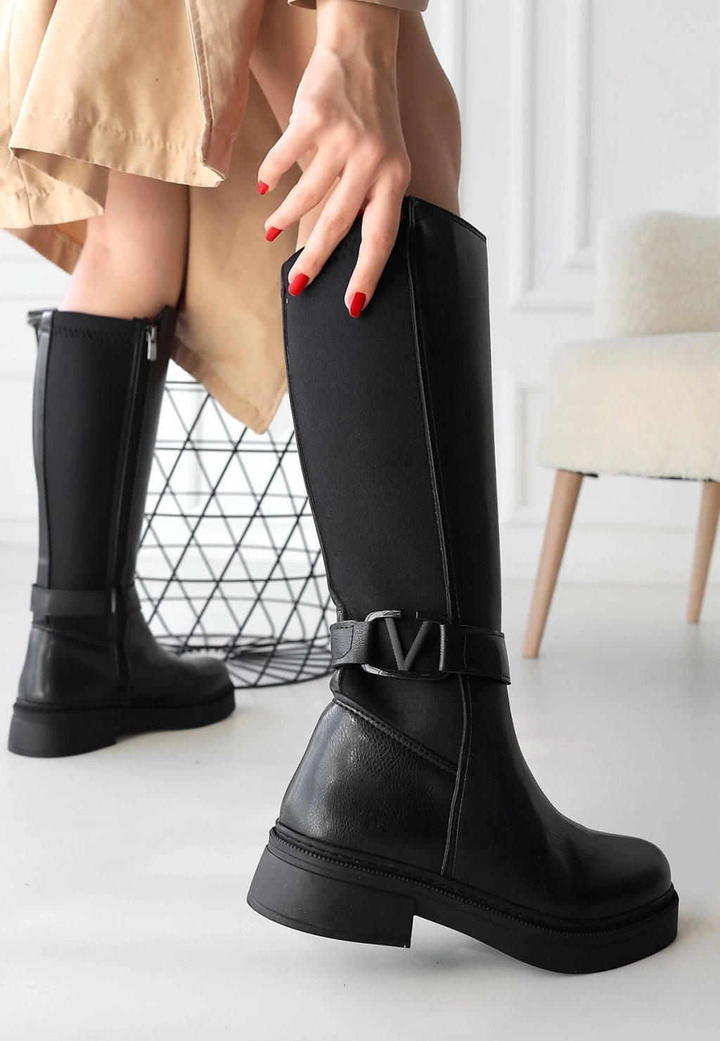 Tiyan Bej Cilt Topuklu Çizme