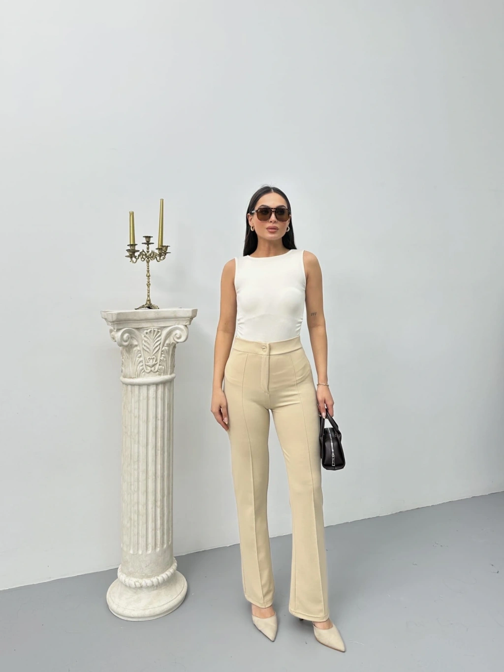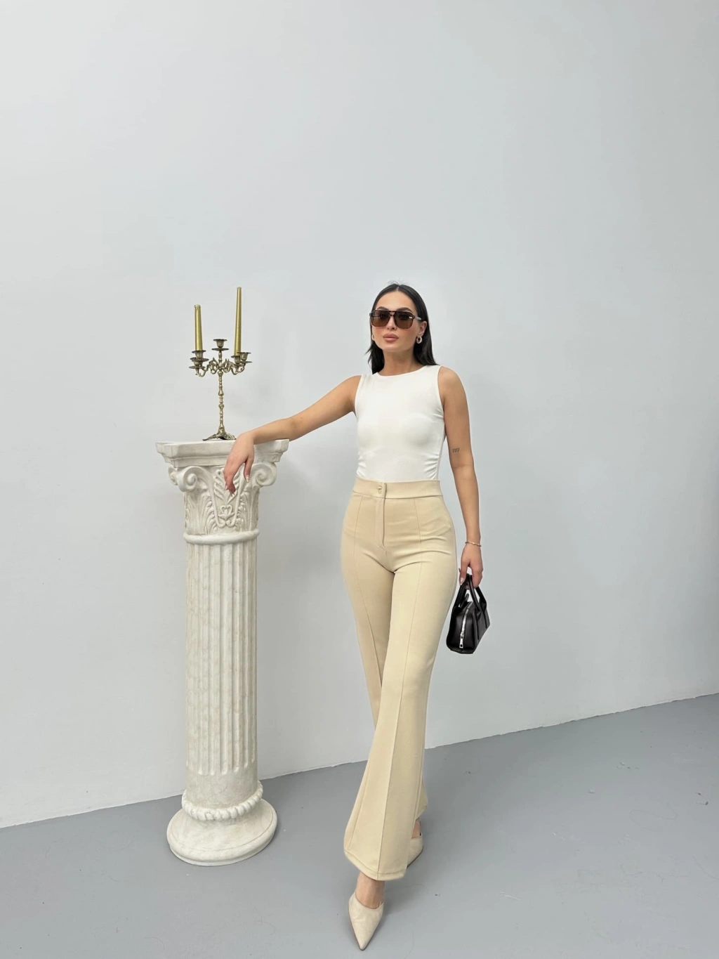 İspanyol yırtmaçlı paça deri pantolon bej hn
