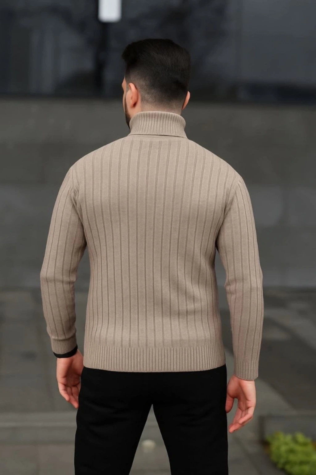 Erkek Balıkcı Yaka Bağazlı Triko Kazak Pamuklu Kalın Fitilli Dokuma, Regular Fit Uzun Kollu Kışlık Model - Bej