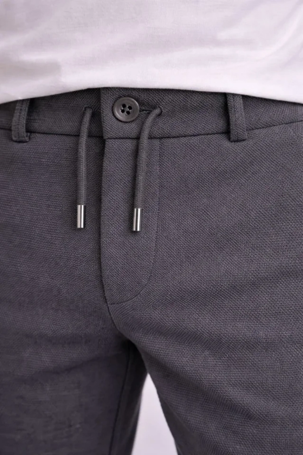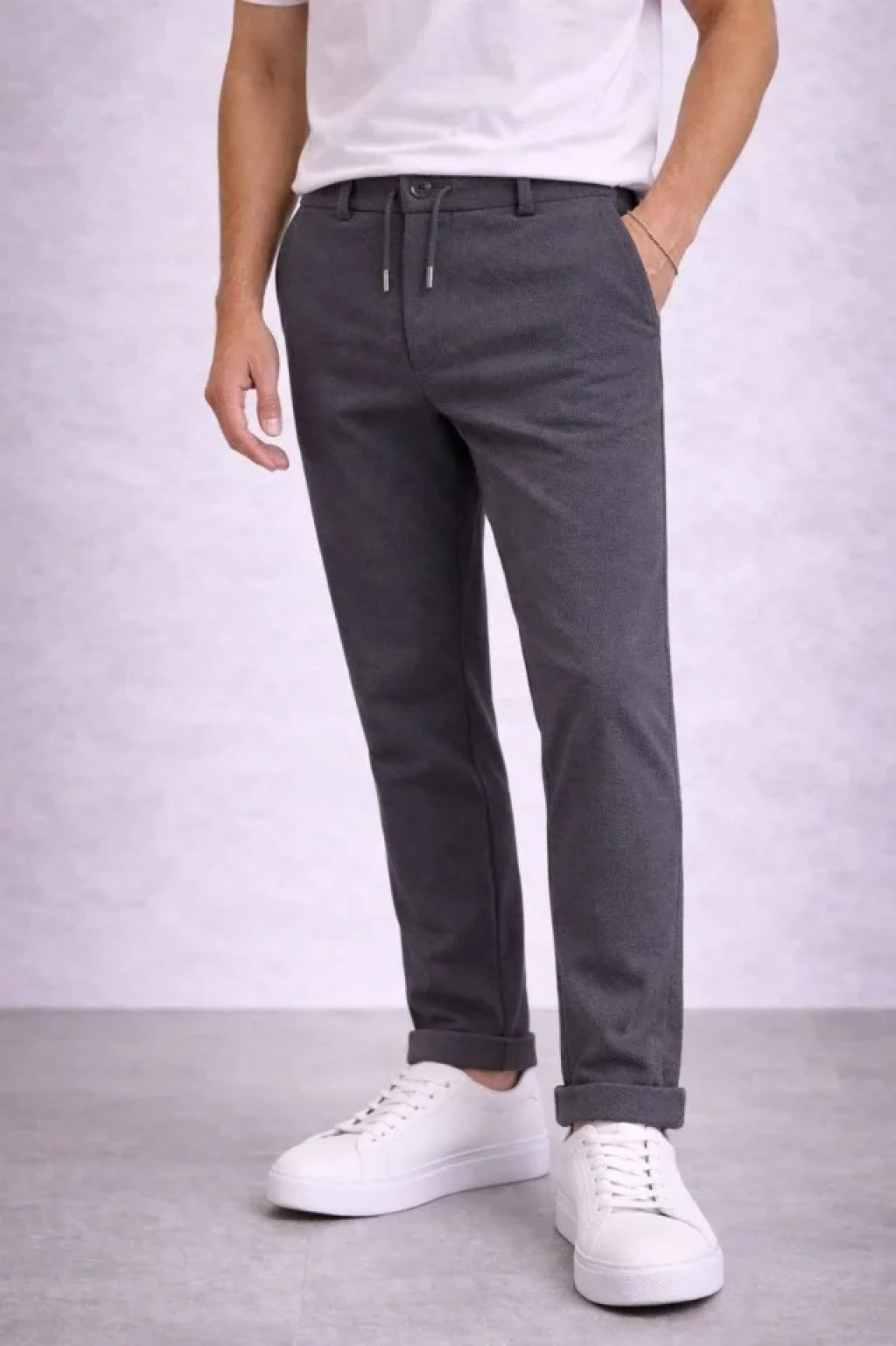 Erkek Diagonel Mikro Dokulu Duble Paça Cepli Pantolon Bağcıklı Bel, Modern Kesim - Füme