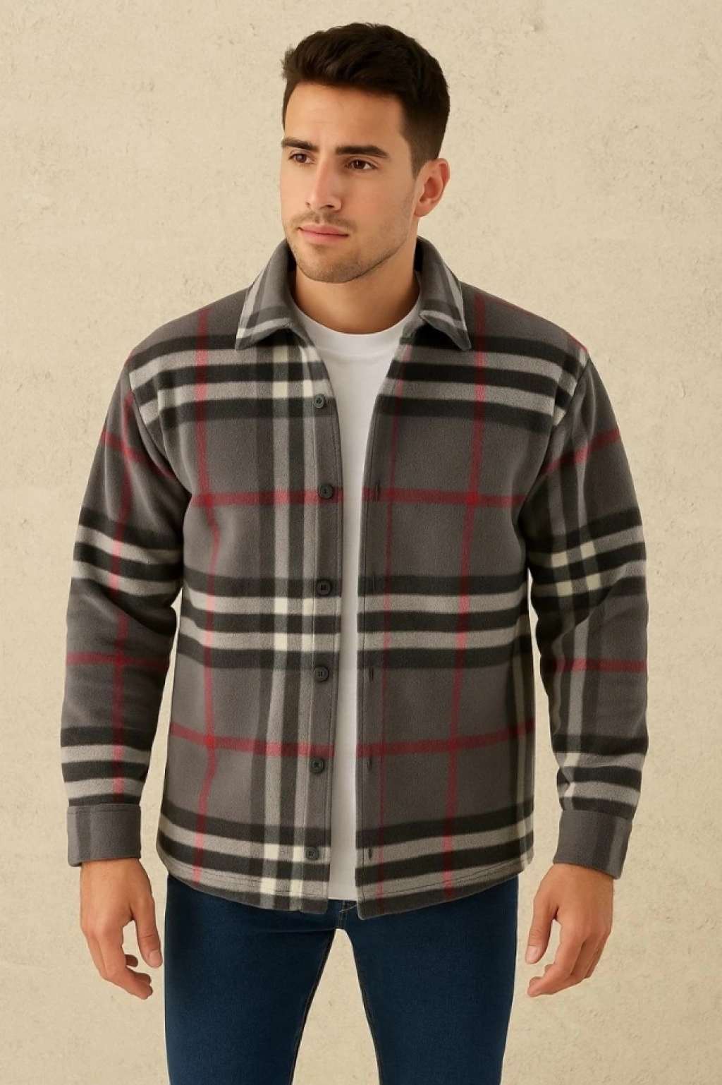 Erkek Ekose Desenli Düğmeli Polar Yakalı Uzun Kollu Gömlek Oversize Rahat Kalıp - Füme
