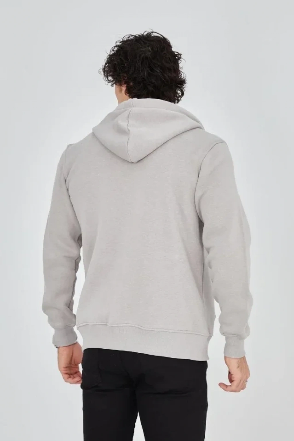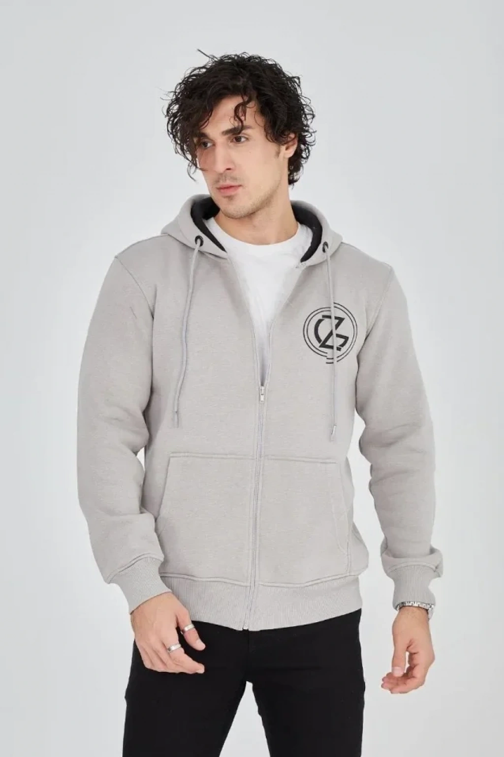 Erkek Kapüşonlu Baskılı Fermuarlı Hırka - Boyalı Gri