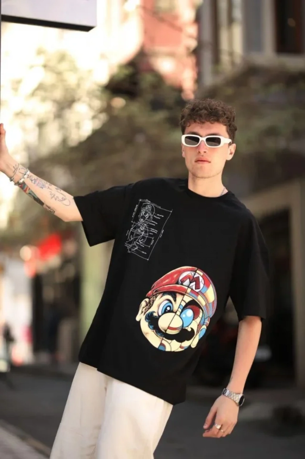Erkek Mario Baskılı Oversize T-Shirt - Siyah