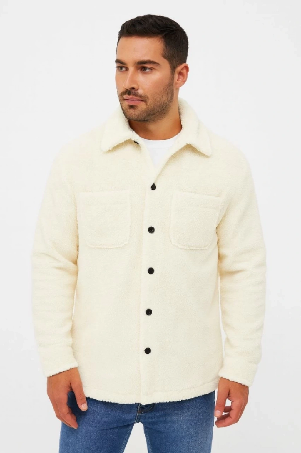Erkek Pelüş Polar Hırka Gömlek – Yakalı, İlik Düğmeli, Göğüs Cepli, Yumuşak Dokulu Kışlık Regular Fit Rahat Günlük Model - Beyaz