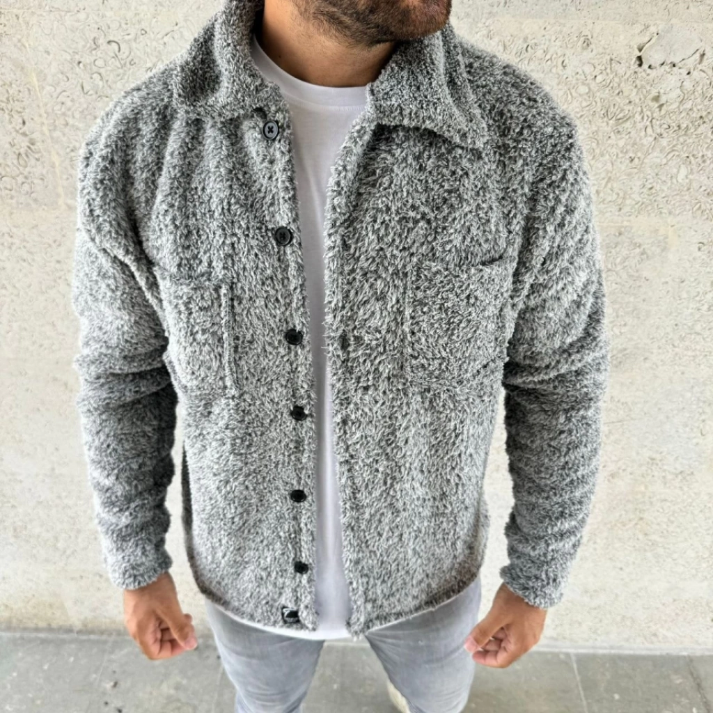 Erkek Pelüş Polar Hırka Gömlek – Yakalı, İlik Düğmeli, Göğüs Cepli, Yumuşak Dokulu Kışlık Regular Fit Rahat Günlük Model - Gri