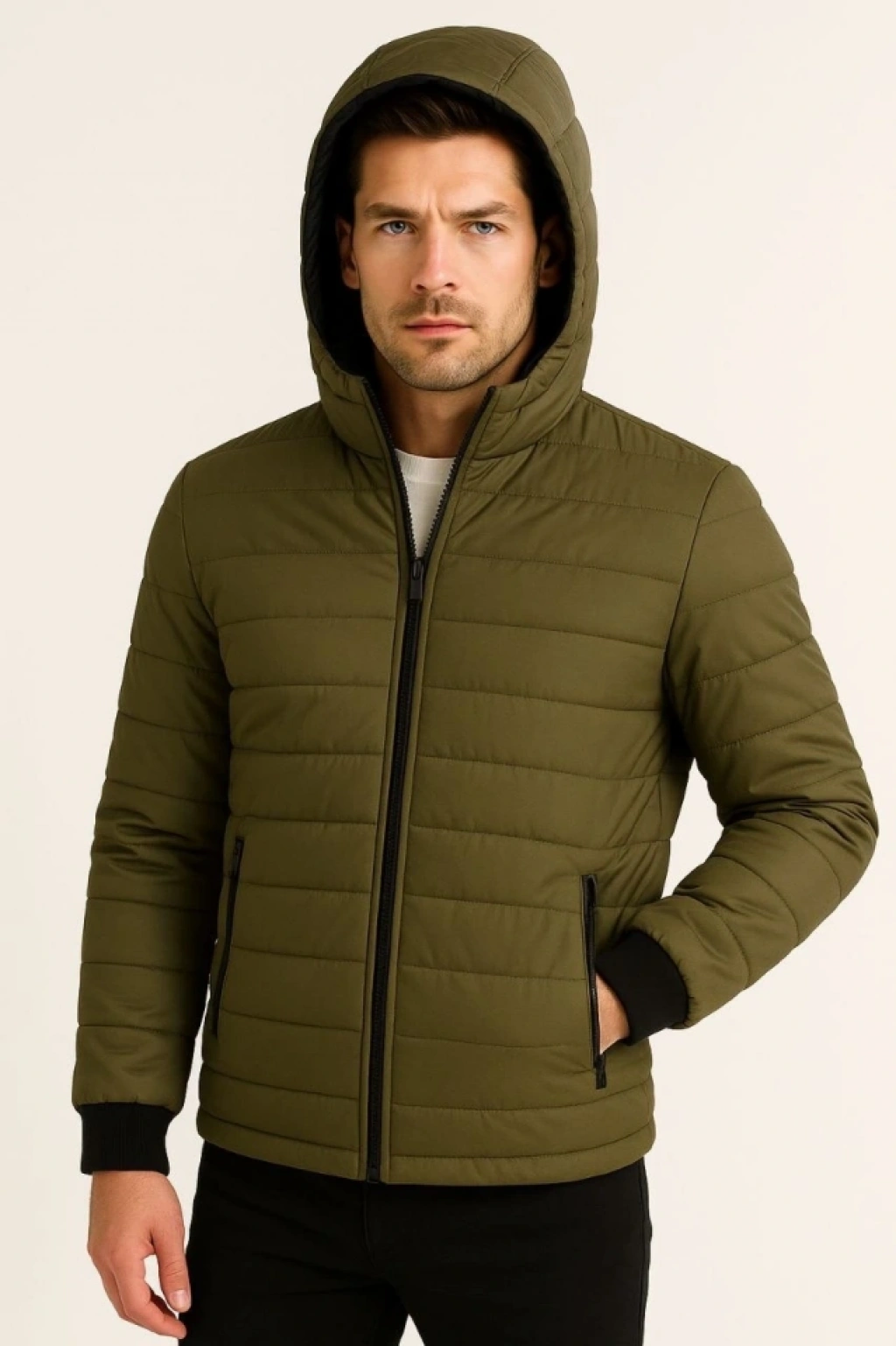 Erkek Şişme Kapüşonlu Fermuarlı Mont Su Itici Kapitone Astarlı Kumaş Cepli Kışlık Rahat Kalıp - Haki