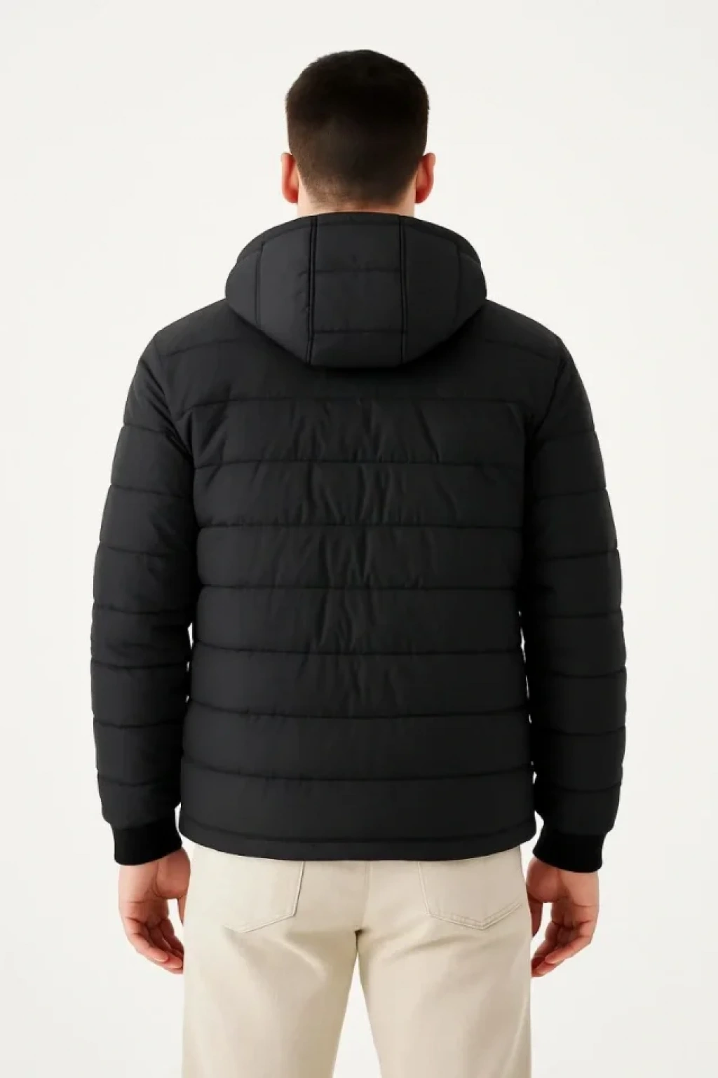 Erkek Şişme Kapüşonlu Fermuarlı Mont Su Itici Kapitone Astarlı Kumaş Cepli Kışlık Rahat Kalıp - Siyah