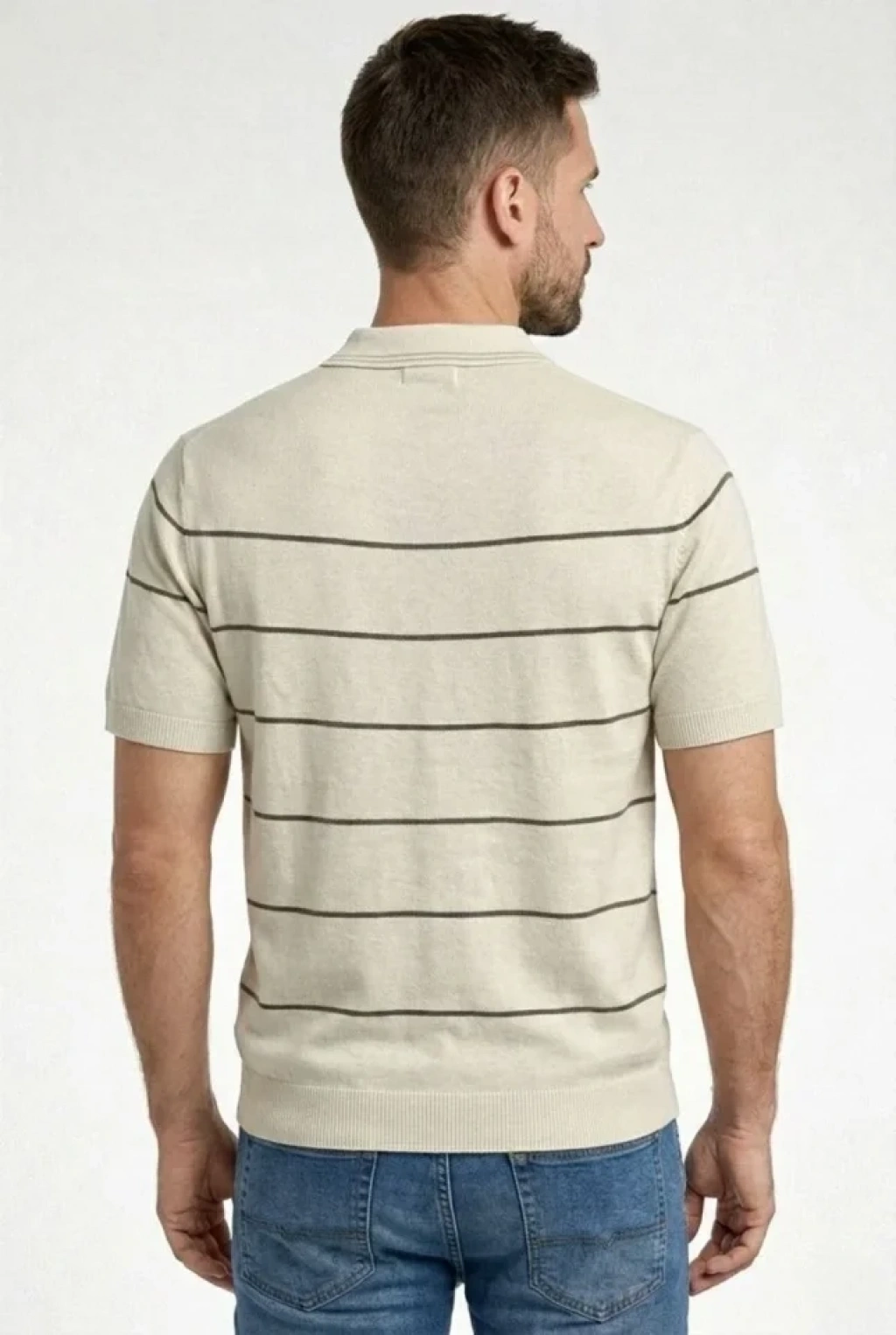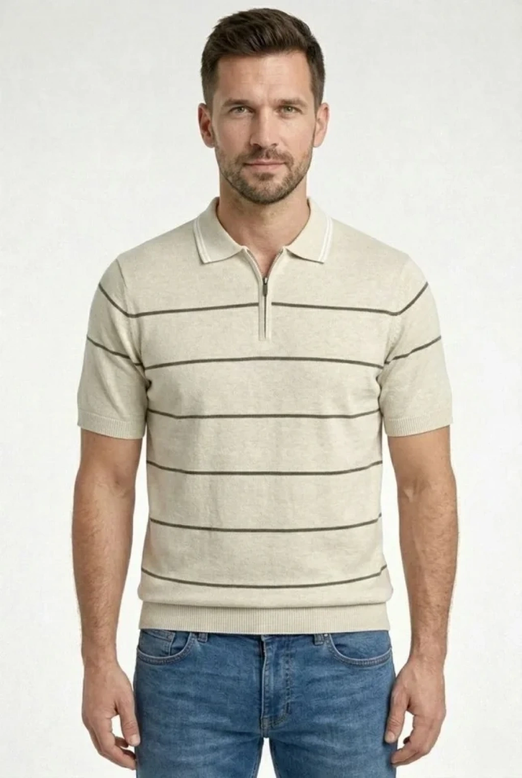 Erkek T-shirt Çizgili Triko Dokuma Kumaş Polo Yaka Yarım Fermuarlı Regular Kalıp Tişört - Bej