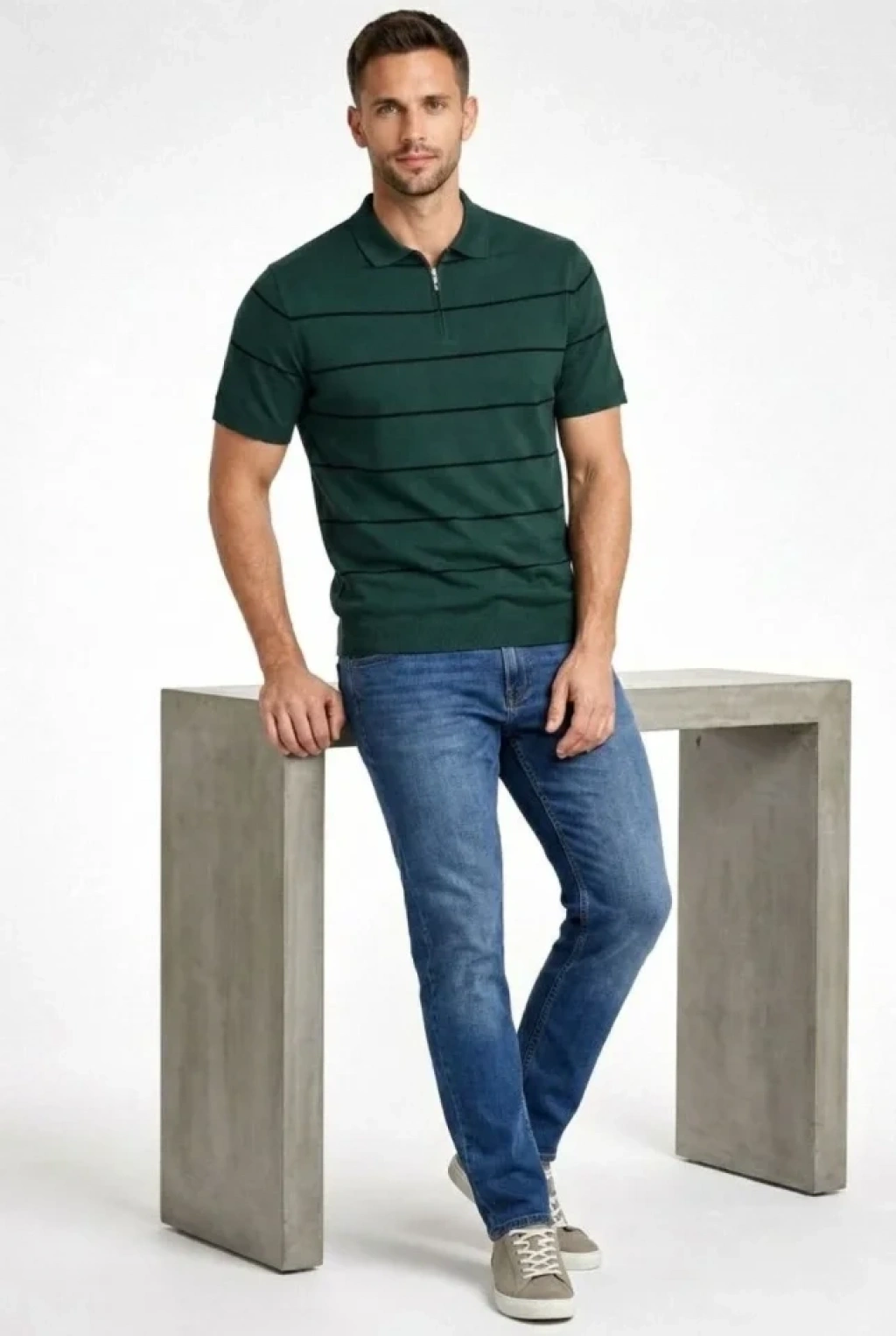 Erkek T-shirt Çizgili Triko Dokuma Kumaş Polo Yaka Yarım Fermuarlı Regular Kalıp Tişört - Çağla Yeşili