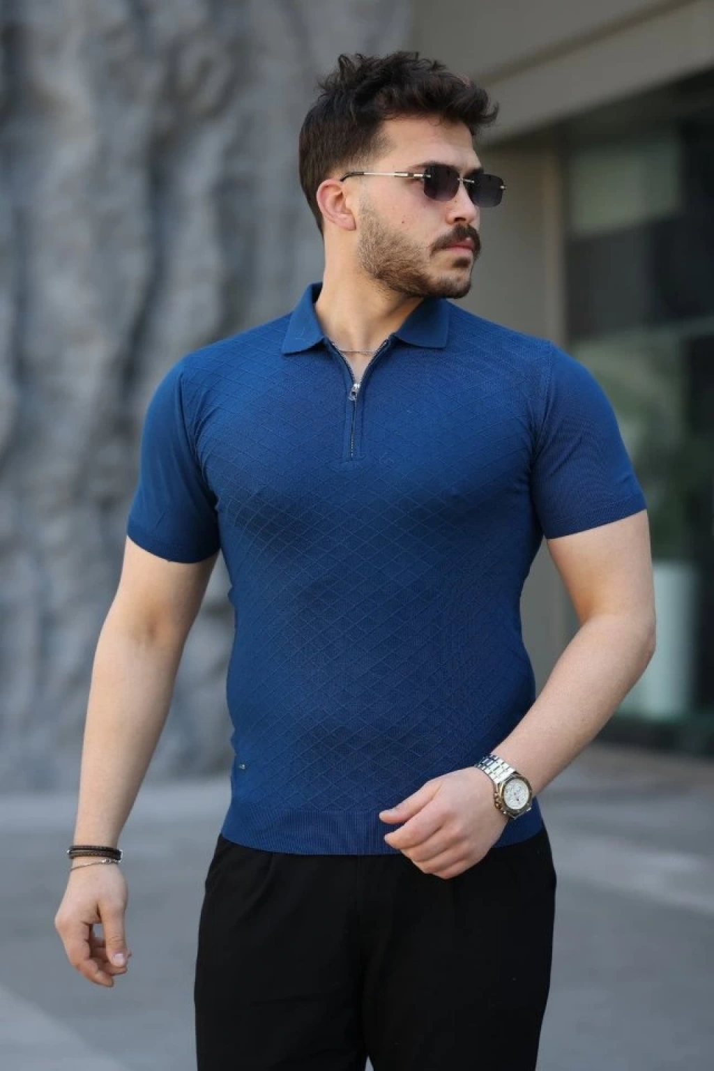 Erkek T-shirt Çizgili Triko Dokuma Kumaş Polo Yaka Yarım Fermuarlı Regular Kalıp Tişört - Çağla Yeşili