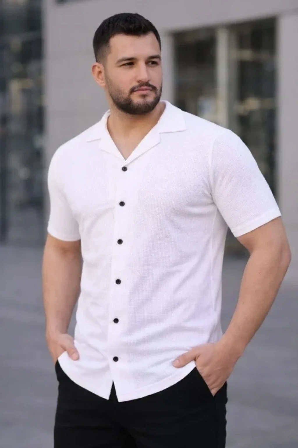 Erkek Waffle Kumaş Kısa Kollu Düğmeli Açık Yaka Regular Fit Gömlek - Beyaz