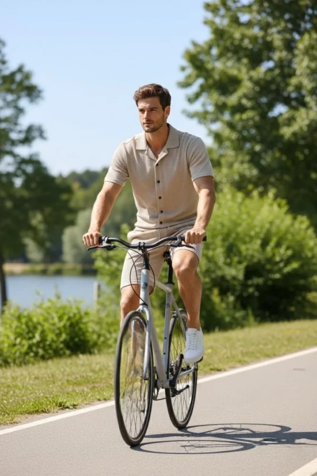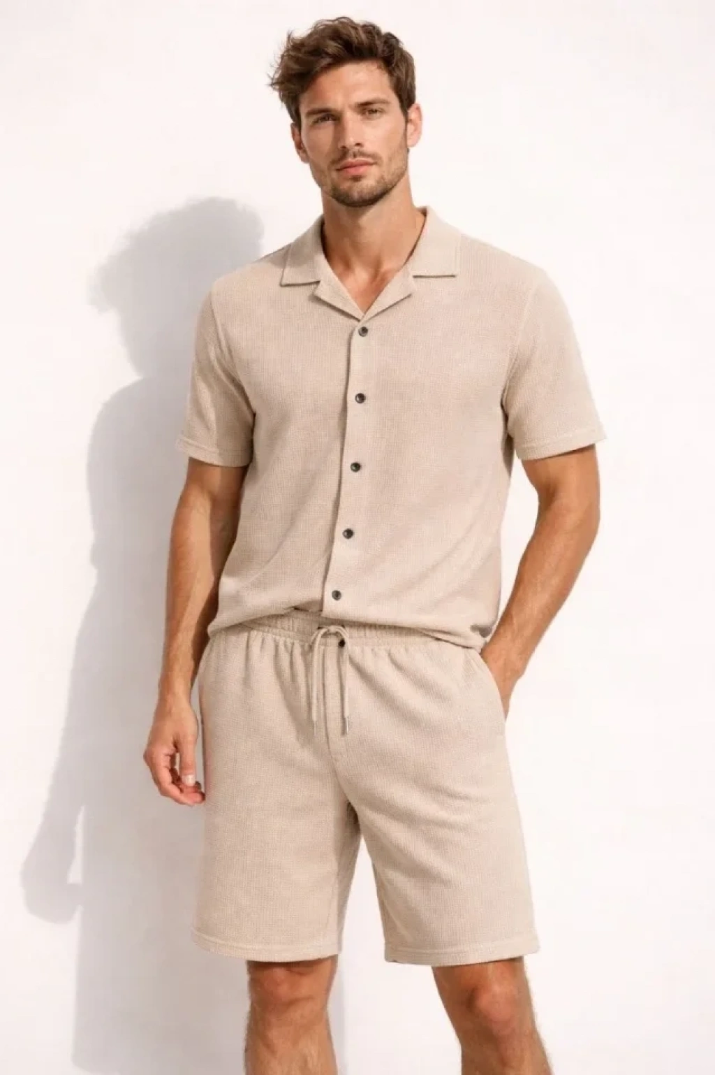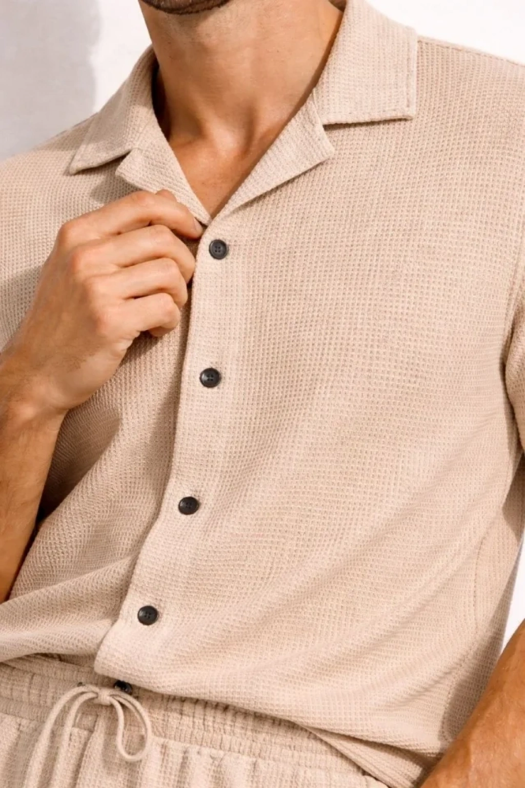 Erkek Waffle Kumaş Kısa Kollu Gömlek Şort Takım Regular Fit Yazlık İkili Set - Bej