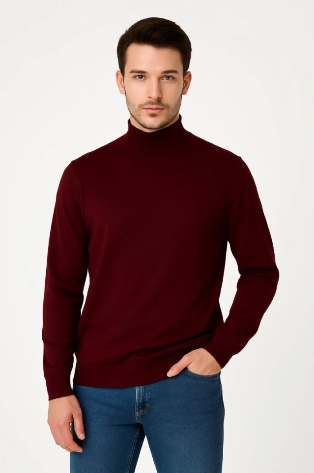 Erkek Yarım Boğaz Triko Kazak Yumuşak Dokulu Pamuklu Ince Dokuma, Uzun Kollu Rahat Regular Kalıp - Bordo