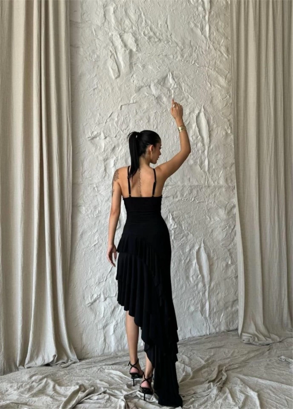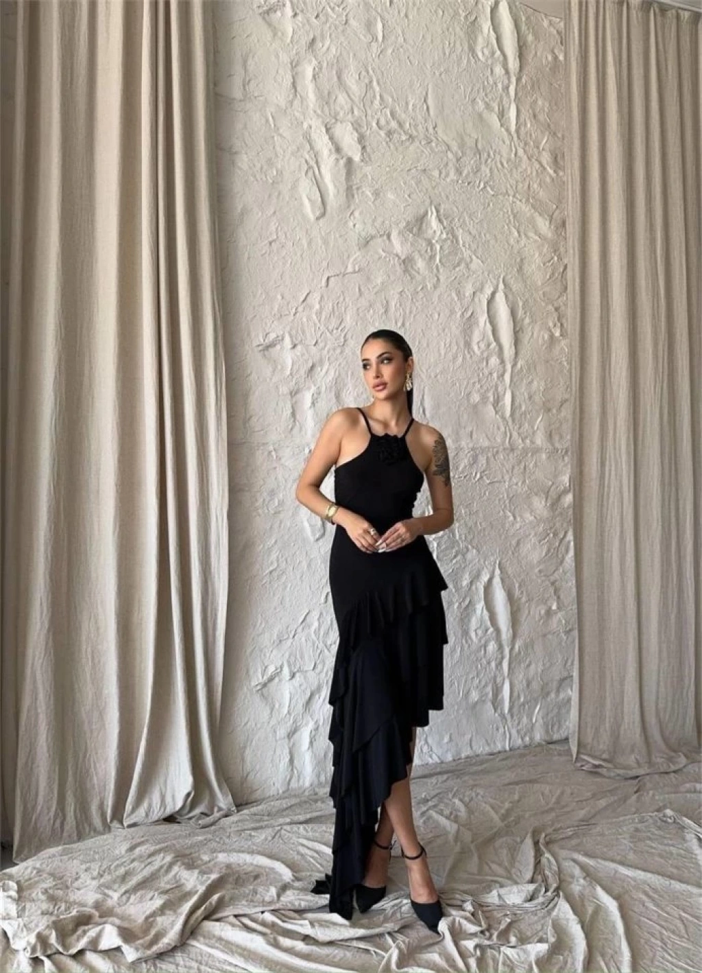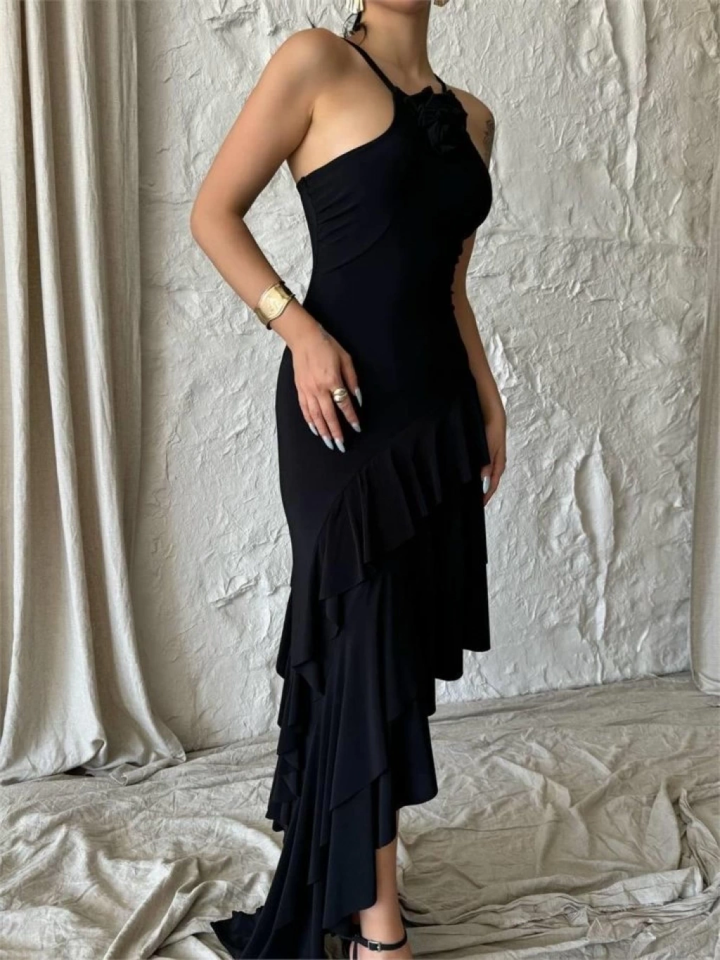 GÜLLÜ ELBİSE ASİMETRİK KATLI - Siyah