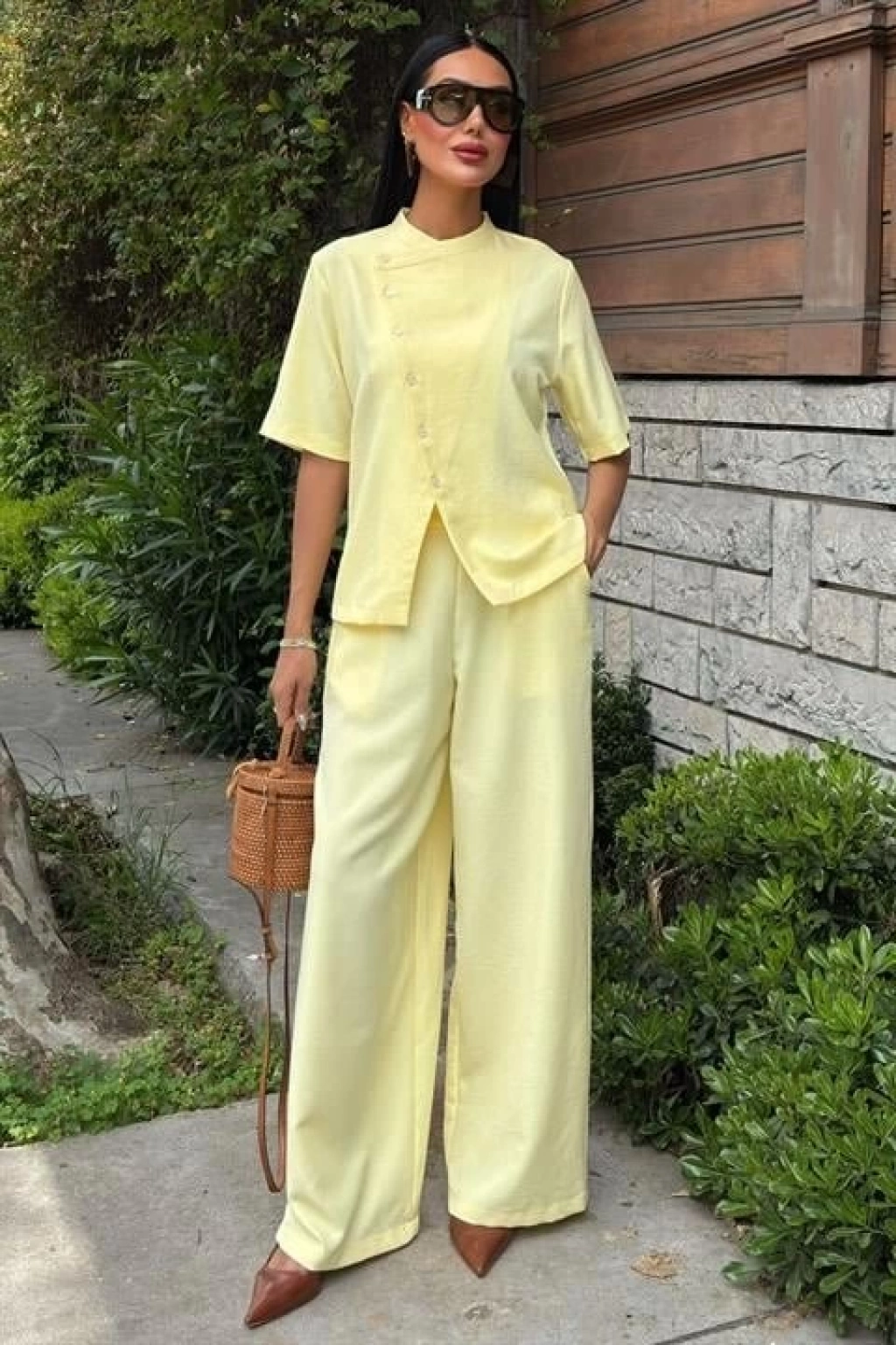 Hakim Yaka Çapraz Düğmeli Plazzo Pantolon Viscon Keten Takım 10209