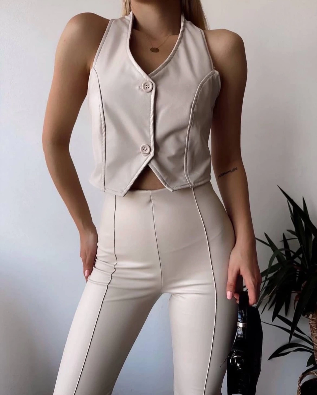 İki düğmeli deri yelek krem s243001