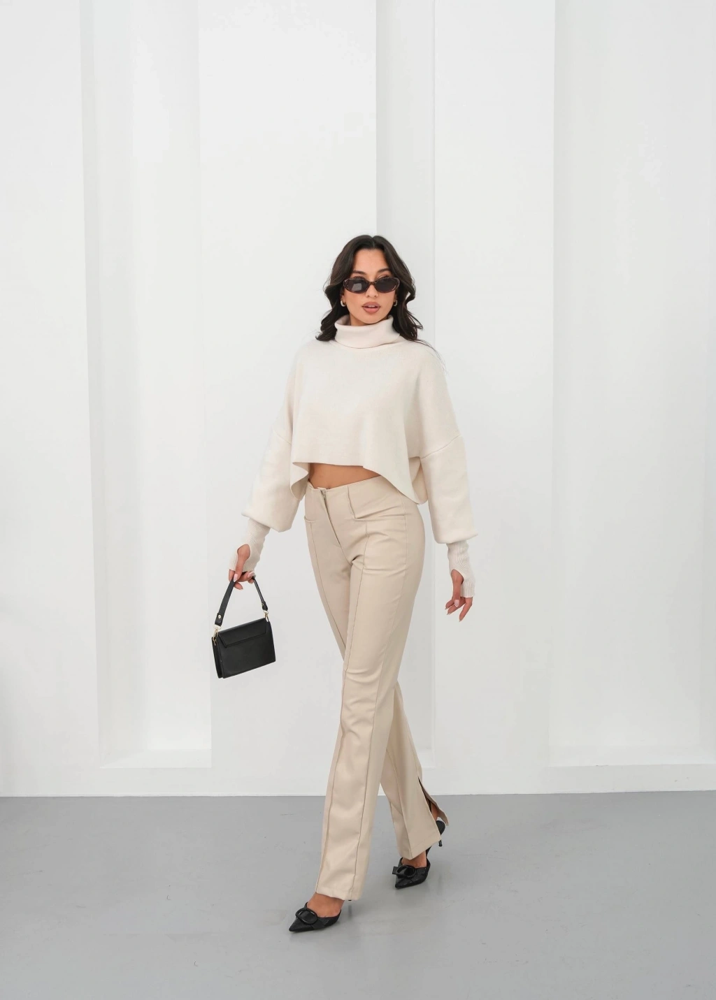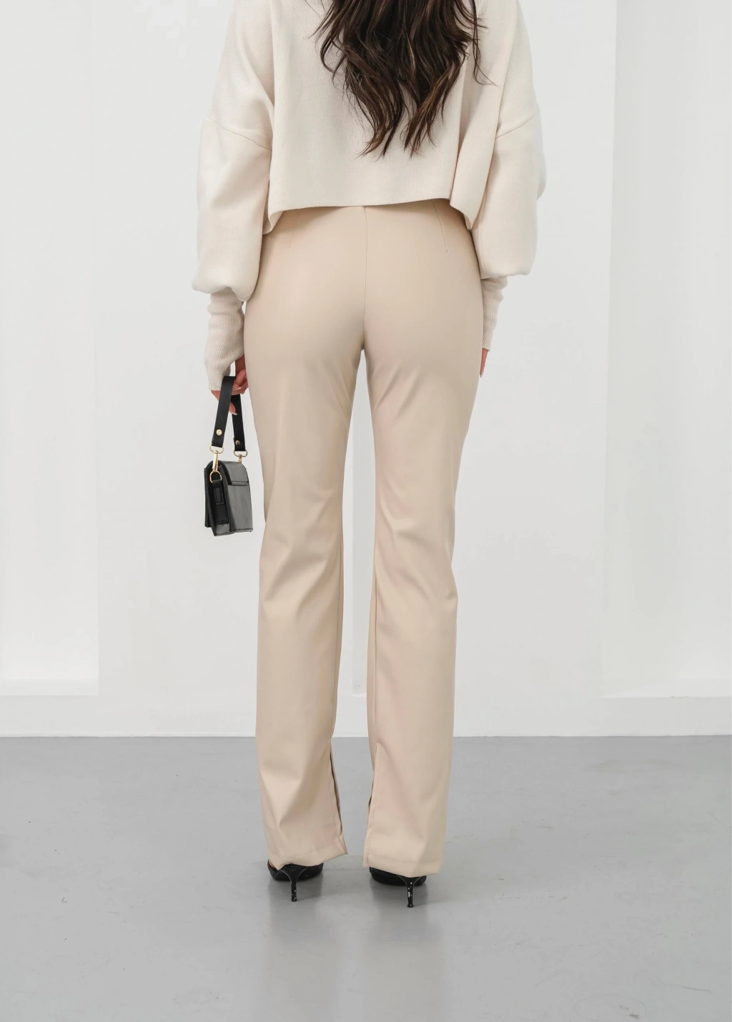 İspanyol yırtmaçlı paça deri pantolon bej hn