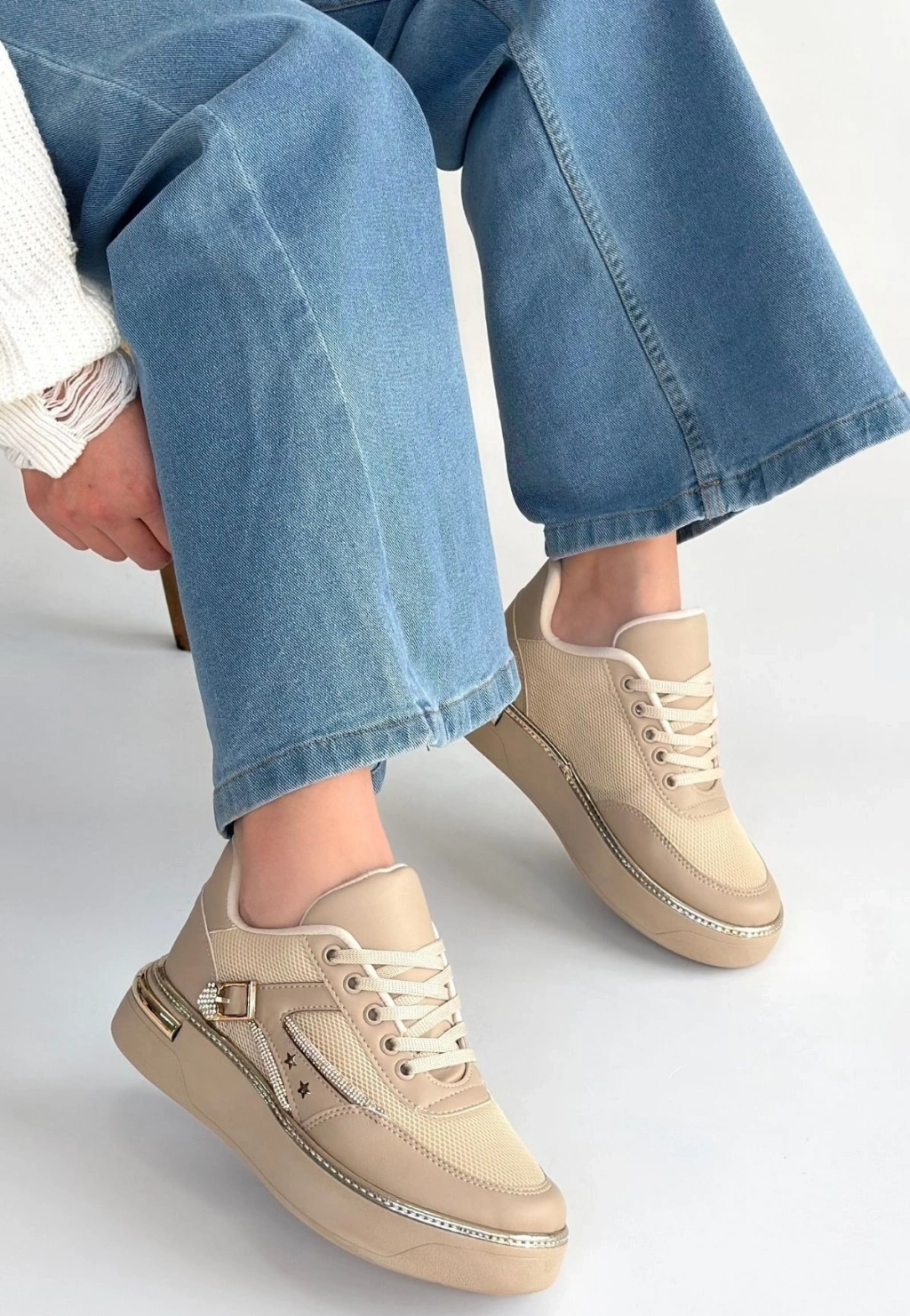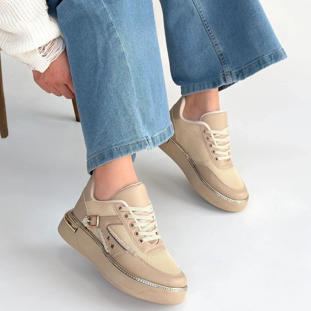 Junda Bej Cilt Bağcıklı Spor Ayakkabı