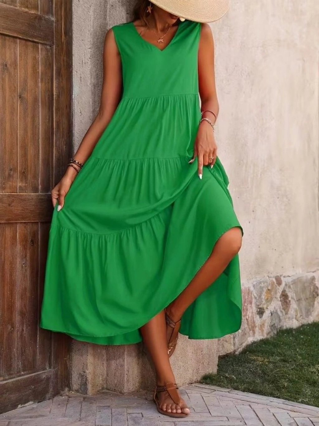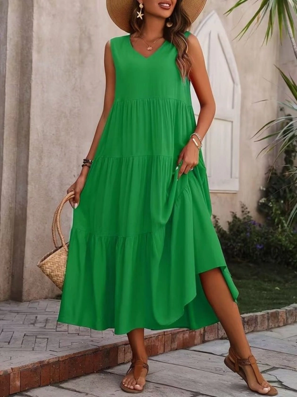 Kadın Askılı V Yakalı Uzun Dokuma Viskon Elbise