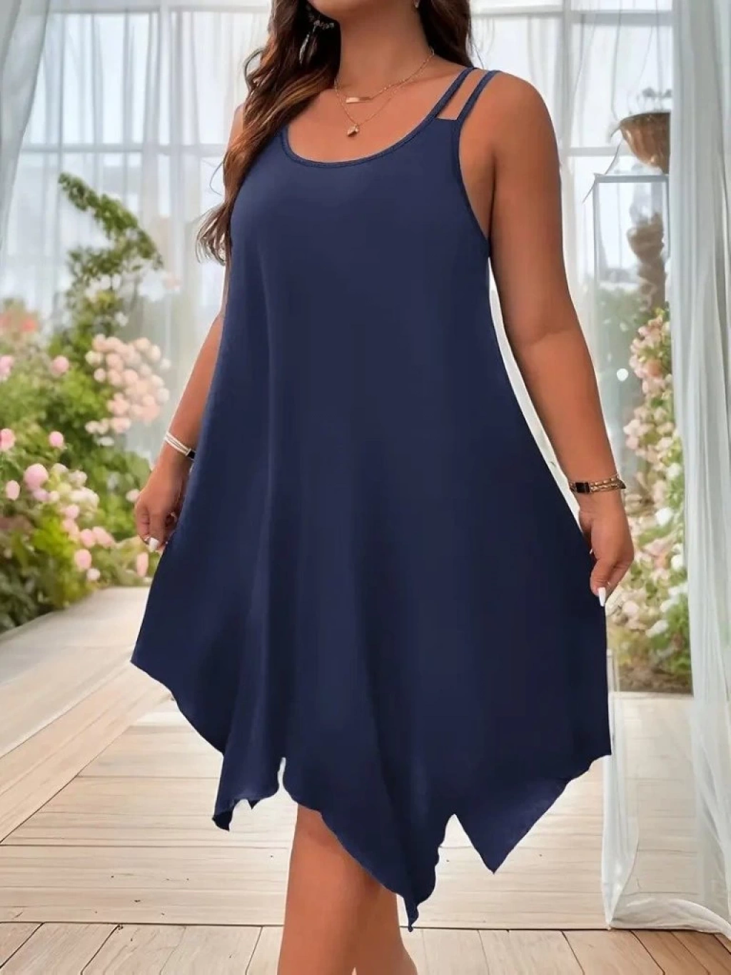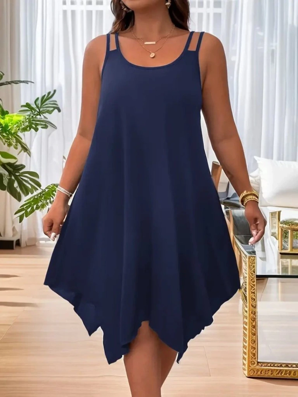 Kadın Askılı Yuvarlak Asimetrik Kesim Detaylı Viskon Elbise