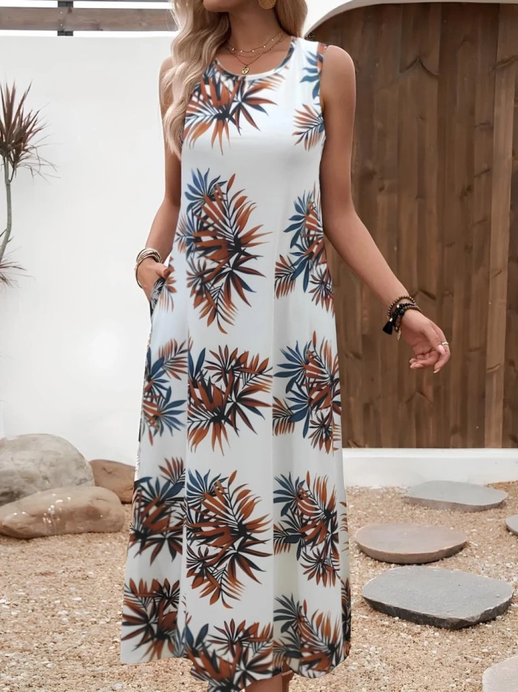 Kadın Askılı Yuvarlak Yaka Cepli Desenli Süprem Elbise