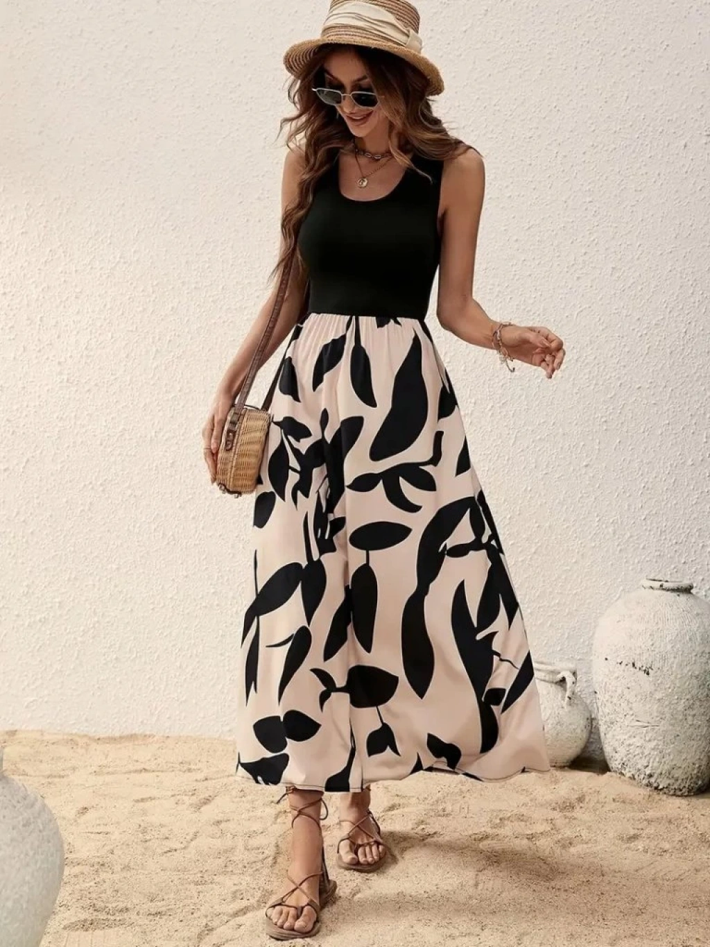 Kadın Askılı Yuvarlak Yaka üst Viskon Alt Desenli Uzun Süprem Elbise
