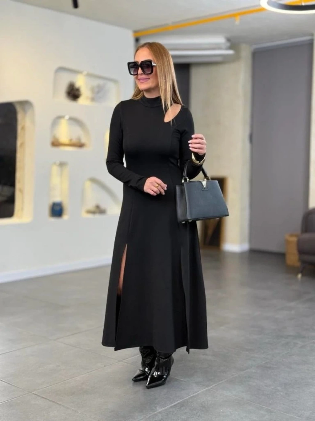 Kadın Balıkçı Yaka Damla Detaylı Yırtmaçlı Uzun Viskon Iki Iplik Maxi Elbise